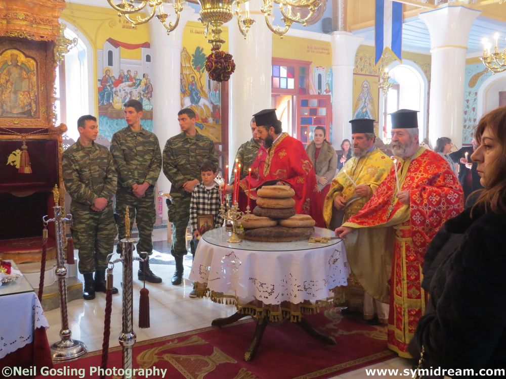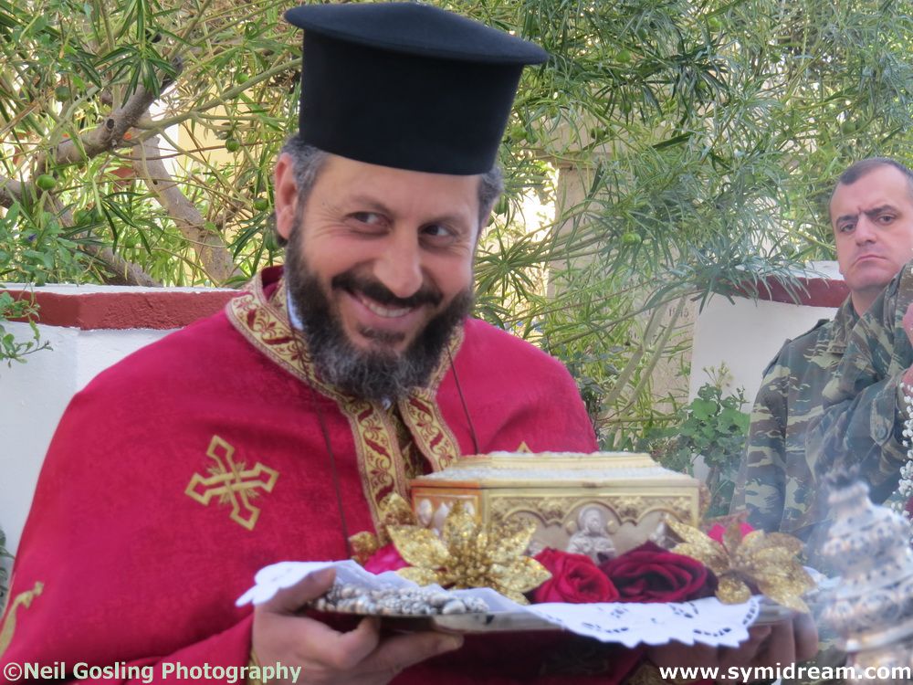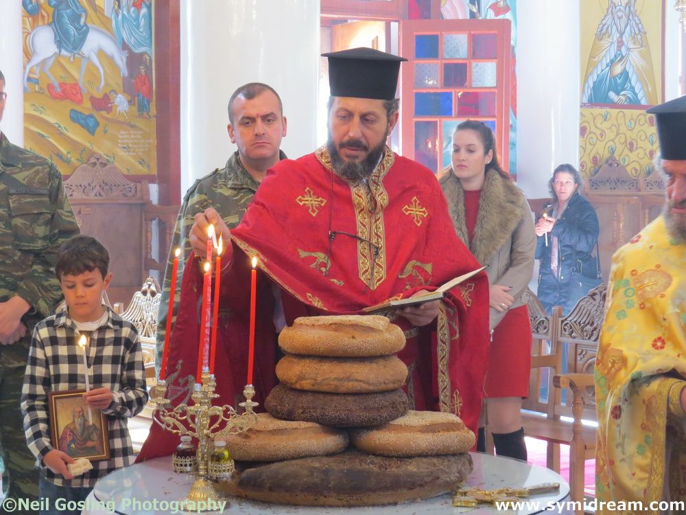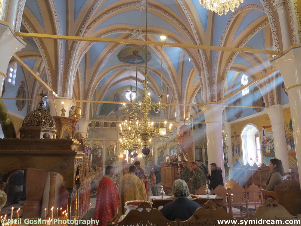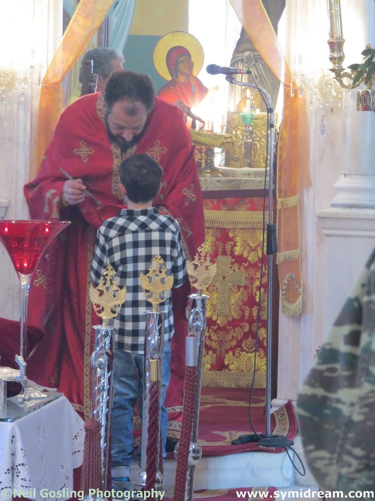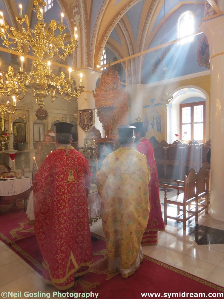 If you’re coming to Symi and are interested to see inside a church, the best time to go is when there is a service on. The buildings are usually locked at other times unless someone is in there cleaning. You’re welcome to attend a service or part of, just make sure you dress appropriately, switch off phones and don’t chatter etc. If unsure what to do, find a stall or seat towards the back and sit/stand as the congregation does. There are certain practises which are not always, excuse me, religiously kept, such as the men sitting on one side and the women on the other. As a visitor, you won’t be expected to keep to these, but if someone does direct you to a certain place, just do as you are told. Name Days are the best festivals to attend (in my opinion), although there are many other regular services during the week. With a Name Day, you will find you’re welcomed to the coffee and cakes afterwards. You will also be blessed during the service. No need to go anywhere, someone will come with a tray of candles and anoint you with holy water – drop a couple of Euros on the tray in return. If in doubt about what to go to, ask your holiday rep or a local person and take some advice first.