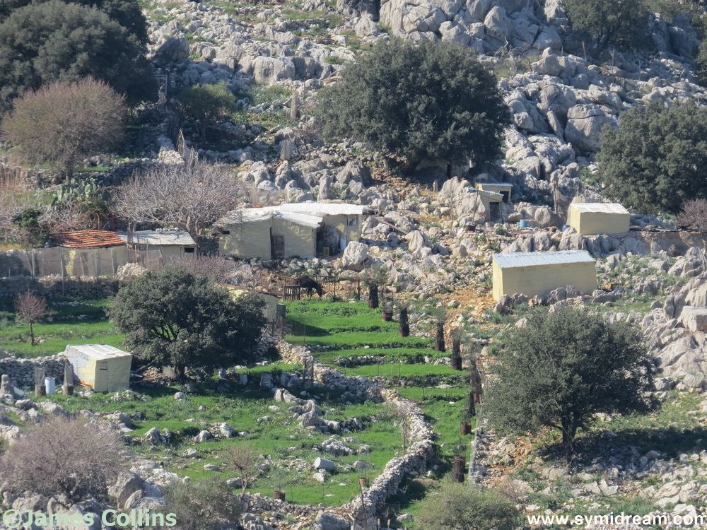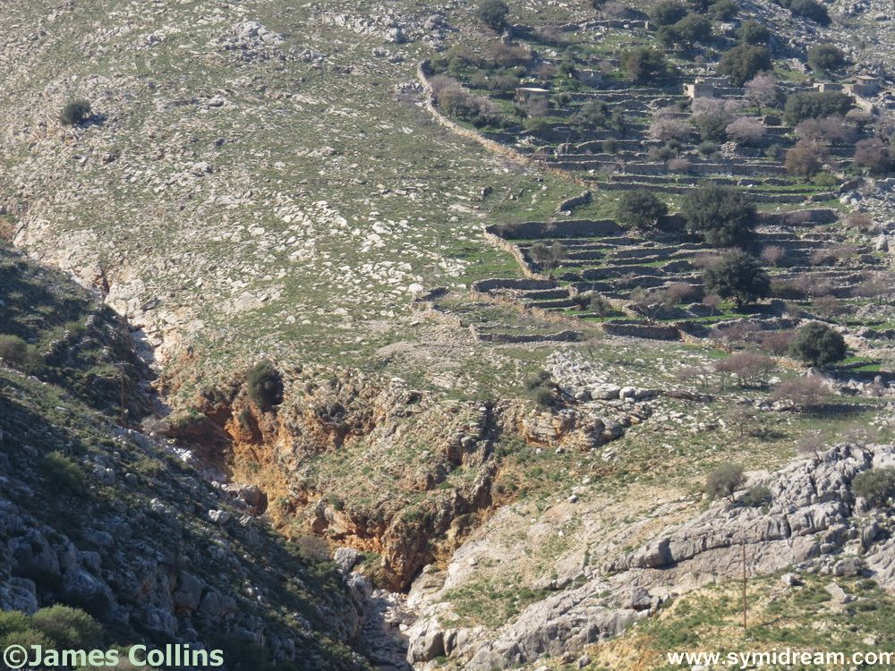 You can also look across to the hills and see terracing and some small farms, a few scattered houses that have been built recently – and I mean one or two built in the last ten years or less, and, if you keep going, you will see the Kataractis and the further hillside of Horio, with the Vigla beyond. You can carry on and then turn left into the back of the village and up to the Castro, or right and down to the back of Yialos on the old and original path to the harbour.