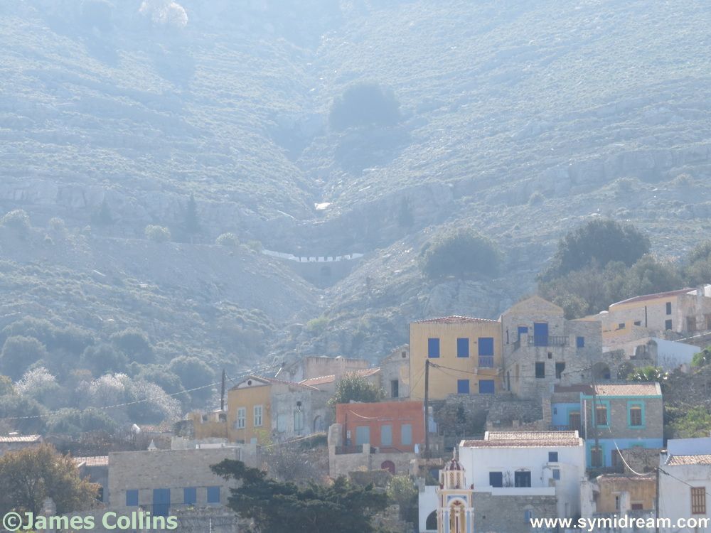 Its takes an S bend up a slight incline and then slopes upwards a little, but it’s not a steep gradient. You can turn left up some steps and into the other parts of the village, or right and down through the hillside to Yialos. You pass the bins on your left, not the most pleasant of landmarks, but an obvious one. Keep going past a few houses, and you have views down to the sea and the harbour. Further, you come to another corner, and there you can see the back of Yialos and over towards Nimborio and Turkey beyond.