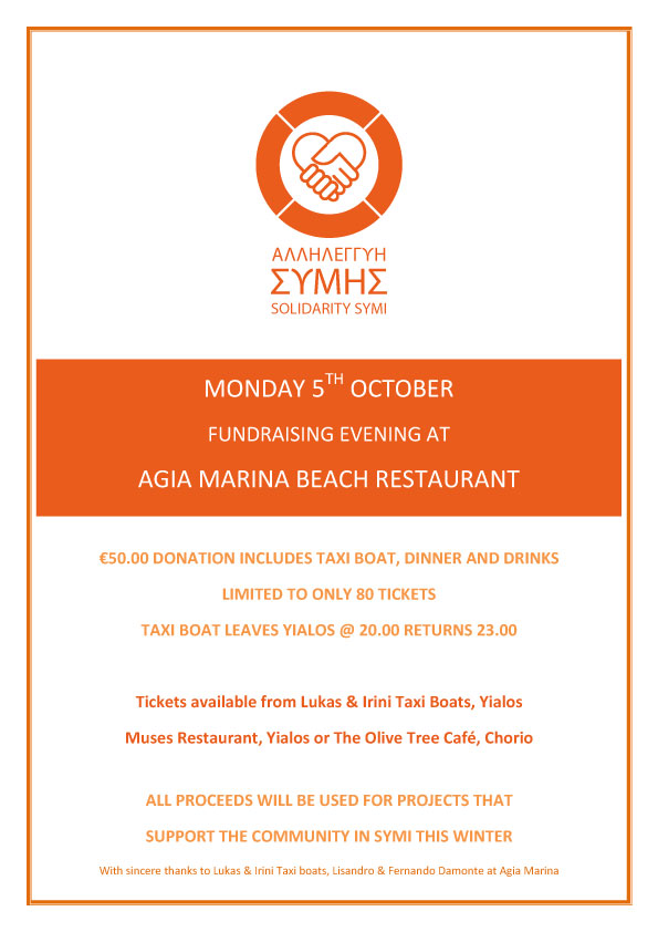 Here’s something that’s going on, on Symi, on Monday evening. If you are here you can get in on the party but be quick as there are only 80 tickets. Leave Yialos by boat at 8pm, head around to Agia Marina beach, enjoy dinner and drinks there, and get your boat back at 23.00, all included in the price and you will be donating towards Solidarity Symi which is raising money for projects that support the community in Symi. Here’s the poster.