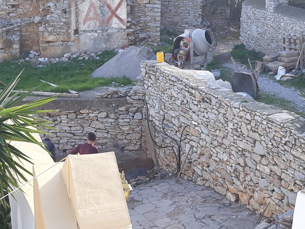 I dealt with that under the disinterested gaze of Thomas, the unwanted ginger tom who lives in the laundry basket, threw some towels down to deal with the mop-up the next day and headed up for dinner. So, finally, we have water back in the house though not flowing as powerfully as before. I am about to try out the shower for the first time, and I will leave you to digest this privateering tale and show you an image from the courtyard steps to give you an indication of how the guys are doing with the new paving for the lane to Lemonitisa.