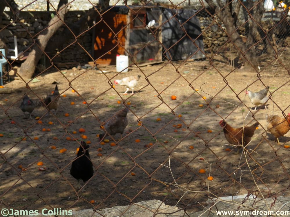I managed to get a blurred photo of a chaffinch on the path ahead – I was walking towards it on zoom, and he was walking away, so it was a bit hit and miss. While being watched by sheep and their lambs, we also saw a blackbird. There were a few other varieties of feathered things about, but all too fast and secretive for me to catch any more on camera. Apart from the chickens that were penned in with some oranges.
