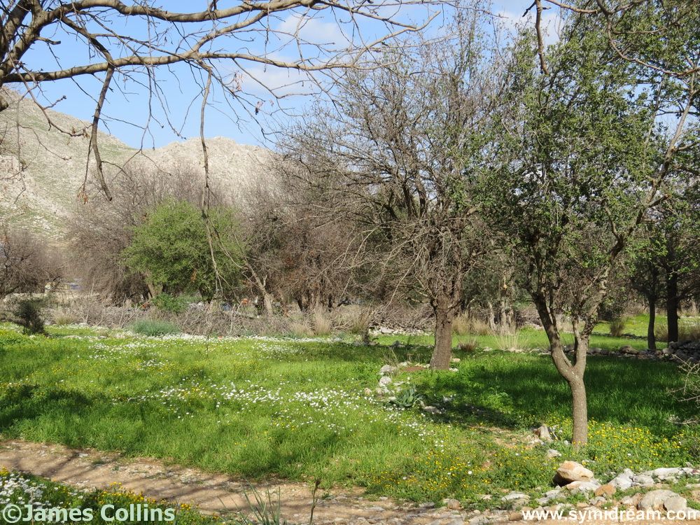 Straight after lunch on Monday, before I had a chance to get comfortable in the ass-groove on the sofa, we set off for another short walk. This one was down the Pedi road, turning off behind what used to be Blooms, near the Aletheni, and following that easy path to the back of Pedi. You come out by the football pitch, turn right and then left next to the new church, and follow the path through what I call the cyclamen meadow. Not all of them are out yet, but other flowers are appearing and some cyclamen, and there’s also blossom on the trees.