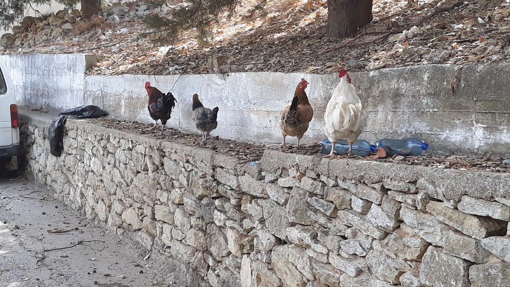 You know, yesterday, after dropping the rubbish and chatting to the bin chickens, I headed off to Sotiris supermarket to pick up a few supplies and came across a roadblock. The flower and garden shop was unloading a van in the lane, and there was no way anyone could get past for a while, so I took the long-cut around the back of the old Olive Tree to come out on the other side of the truck, only to be faced with another potential delay…