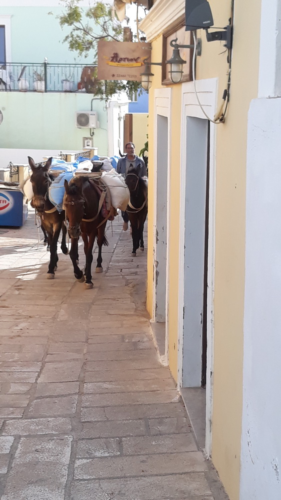The mules still work on Symi, delivering to parts other transportation cannot reach, and we often hear them coming past the house, bell tinkling, hooves clomping stoically, and their boss calling ‘Oishi, oishi’ which is a version of ‘oxi’ I guess, but sounds like the Japanese word for delicious. (Or similar, and I picked that up from MasterChef, so it might be wrong.)