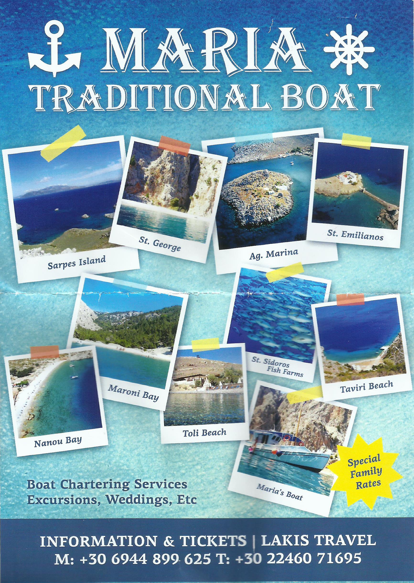 I took the bus down from the village with Mother yesterday, receiving a cheery welcome from Thanasis as always. In Yialos, he gave me a leaflet advertising a new set of trips organised by Lakis Travel. I’d not heard of these before so I thought I’d scan the leaflet so you can also share it. The boat, the Maria, is running day trips seven days per week and taking groups of people to some of the more inaccessible bays around Symi; Sarpes Island, St Sidoros and Taviri, for example. The trips also take in Str Emilianos, Nanou, St George and other places according to the daily itinerary, plus it’s available for private parties, weddings and so on. Here’s the front cover (sorry about the fold):