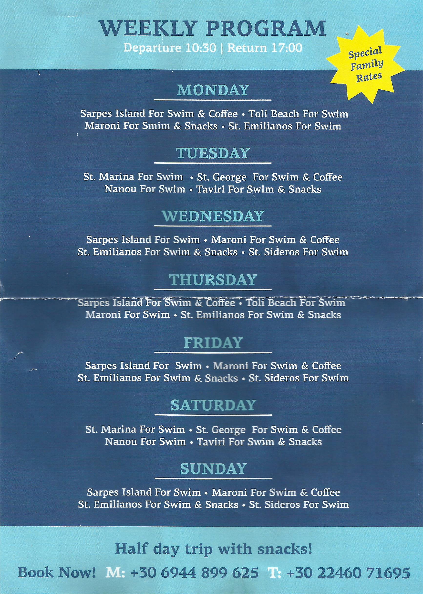 If you’re not sure where Lakis travel is, it’s on the south side of the harbour, that’s the same side as the bus stop and taxis, along the waterfront. There’s a sign outside, so you can’t miss it. I’m not sure of the prices of these trips yet, but the flyer tells me they run from 10.30 to 17.00 each day. You can always phone to enquire: +30 6944 899 625 for the mobile, and the landline at the office is +30 22460 71695.