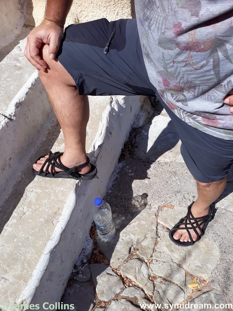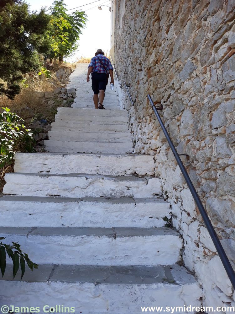 And then the walk back up the ‘lazy steps’ which is not actually their name. The ‘lazy steps’ are further along the harbour where those who weren’t working or didn’t want to work, used to sit in the shade. Still, the slope ‘n’ steps is a good walk. Not as long as the Kali Strata walk up, but steeper with more steps being almost too high to manage. That’s a 1.5-litre bottle of water there which is just over one foot high so you can see (below) the height of some steps.
