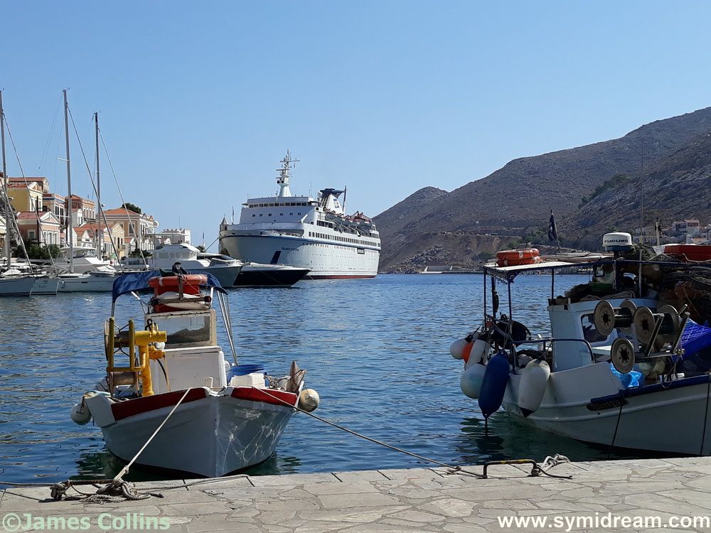 On Wednesday in Yialos, I counted at least five day-trip boats, the Dodecanese Express and also a cruise ship, so the harbour was fairly buzzing in the late morning. It may not look like it in all the photos as many people were in the shade and my phone camera didn’t pick them out. The Poseidon was busy and just setting off, the taxi boats had lots of passengers, and many of the cafes were nearly full. All hopeful and a good sign, as long as it keeps up and the day-trippers are not bringing their all-inclusive packed lunches with them.