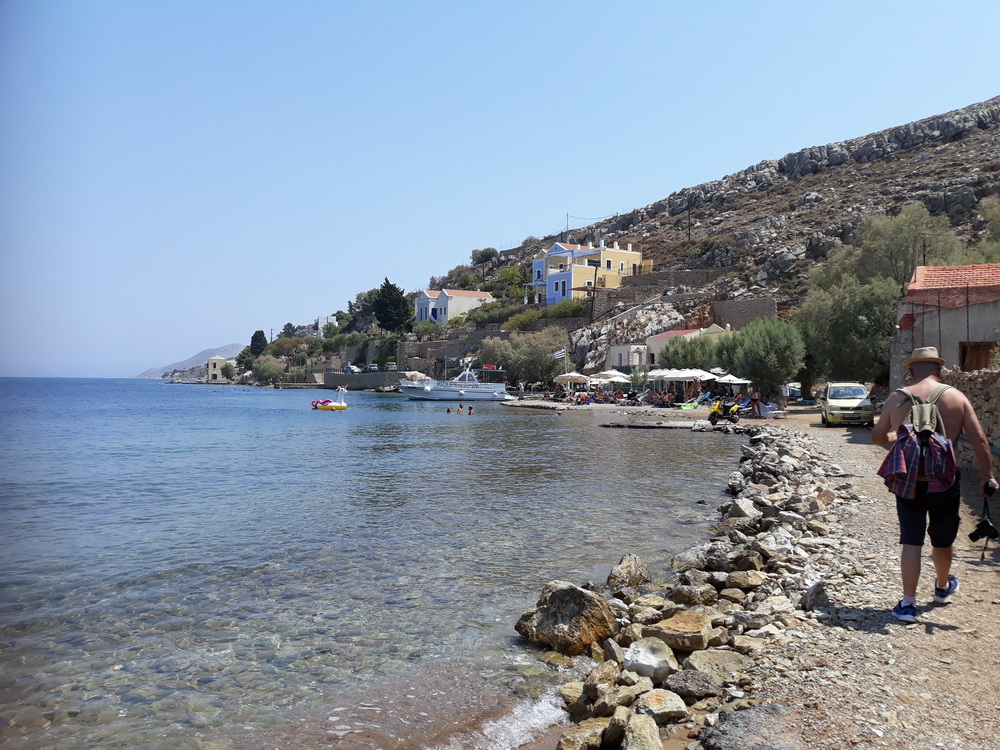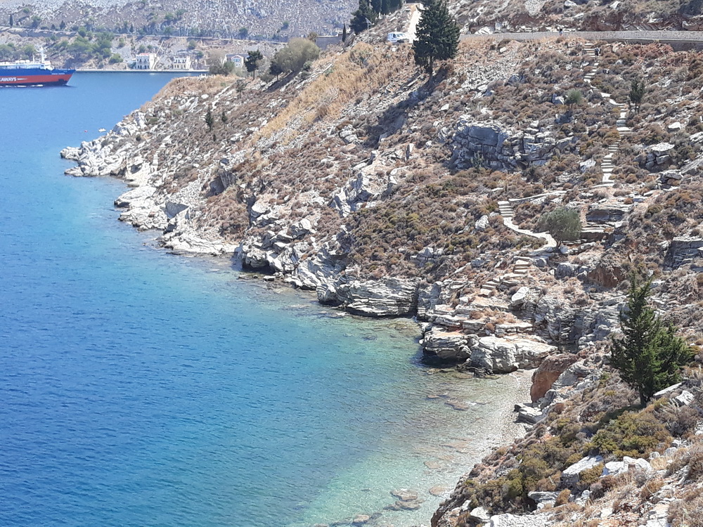 As I was saying yesterday, we tend to take the coast road back from Nimborio to Yialos, so we have a chance to look at the sea and the coves on the way around. There’s not very much shade, although there are now seats (concrete) to rest on and some are under the few trees. It is possible, at certain times of the day, to catch the train back as it runs nearly to Nimborio, but now it has only one carriage, you might find it full, so I wouldn’t rely on it.
