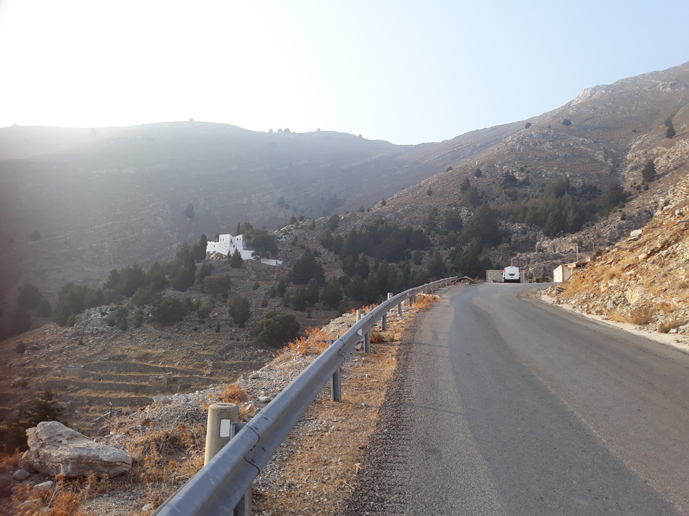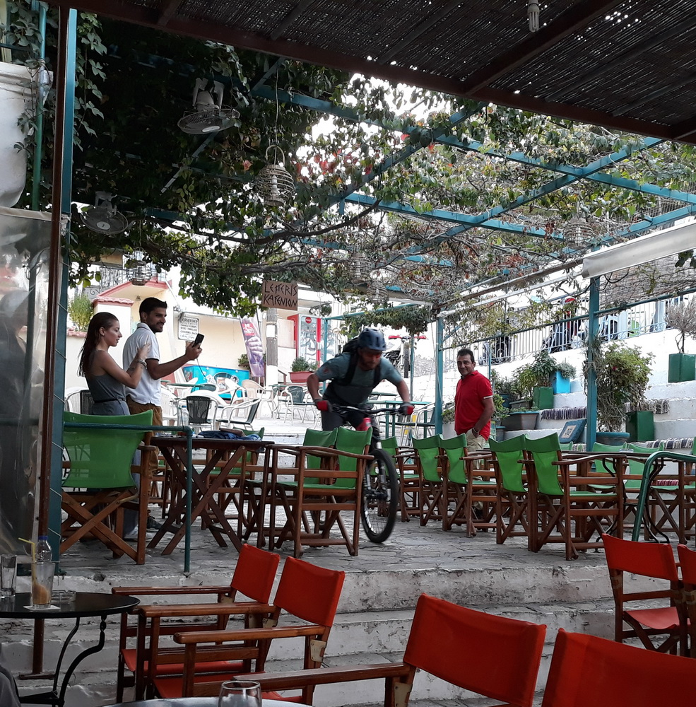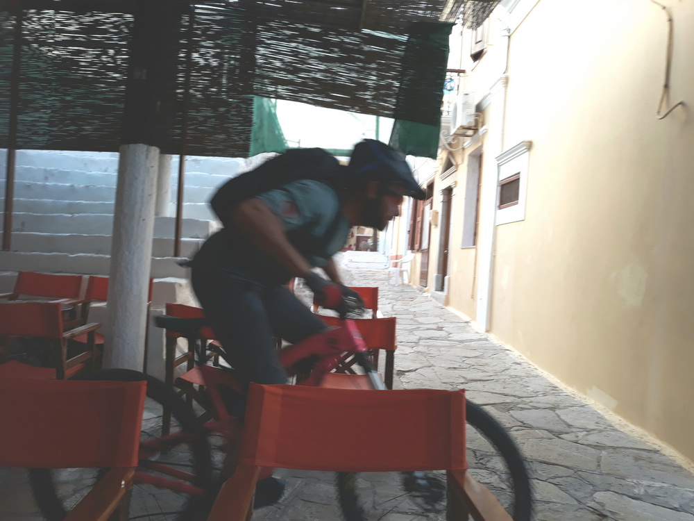 There was some excitement and then consternation in the square the other day. Sitting there with my frappe and the usual Rainbow guests when a guy comes up the steps carrying a mountain bike. Full outfit, helmet, nice bike, obviously an enthusiast. ‘I’m coming back…’ or something, he mumbled as he weaved through the extra chairs and tables Lefteris’ kafeneion had put out ahead of a private celebration happening there later. I reckoned he was going to be cycling past downhill in a few minutes – we’ve seen other people do this wearing GoPro cameras and filming the descent down the Kali Strata. Sure enough, a few minutes later, he comes hurtling back at high speed, dodging the chairs, tables, guests, Lefteris and his mates next door, whizzes past us, bouncing/flying down the steps and on towards Yialos.
