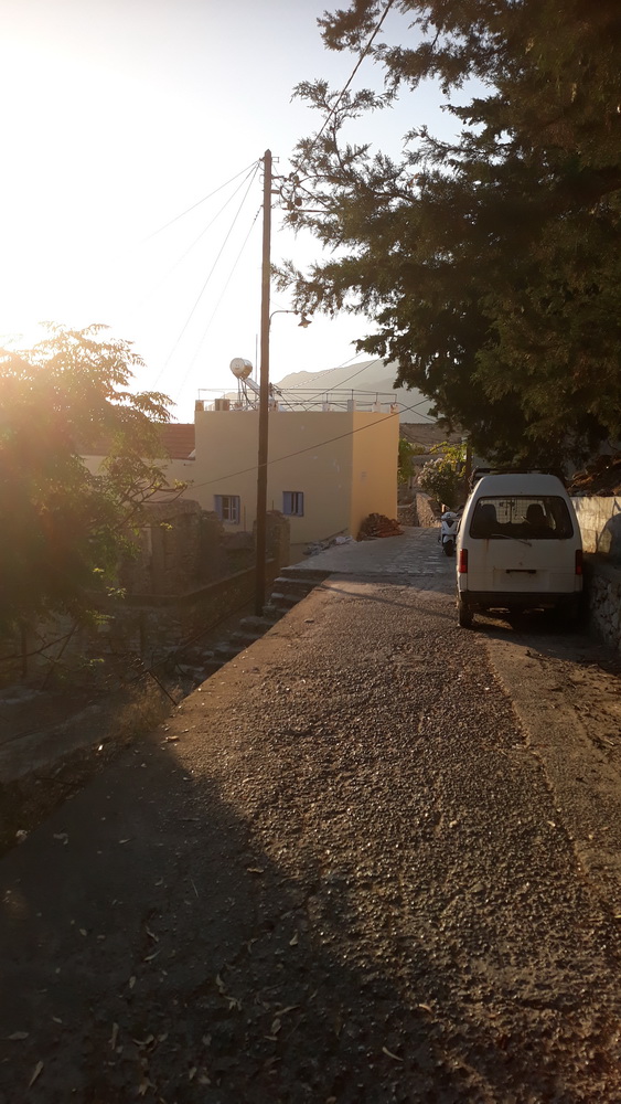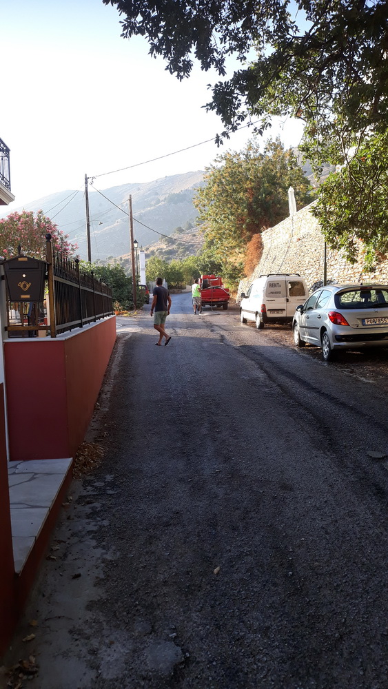 Wandering back from To Vrisi the other morning, I was met by a traffic jam. Not the usual mules or goats, but the council fire trucks coming towards me with Yiannis from the village square watering the cars. I think (but I’m not sure) they were actually watering the verges, but the lads were having some fun along the way and washing down a few cars as they passed. He missed me but did manage to douse his colleague amid much laughter. The sight got my day off to a good start, unlike yesterday when I woke with indigestion at two in the morning and couldn’t get back to sleep.