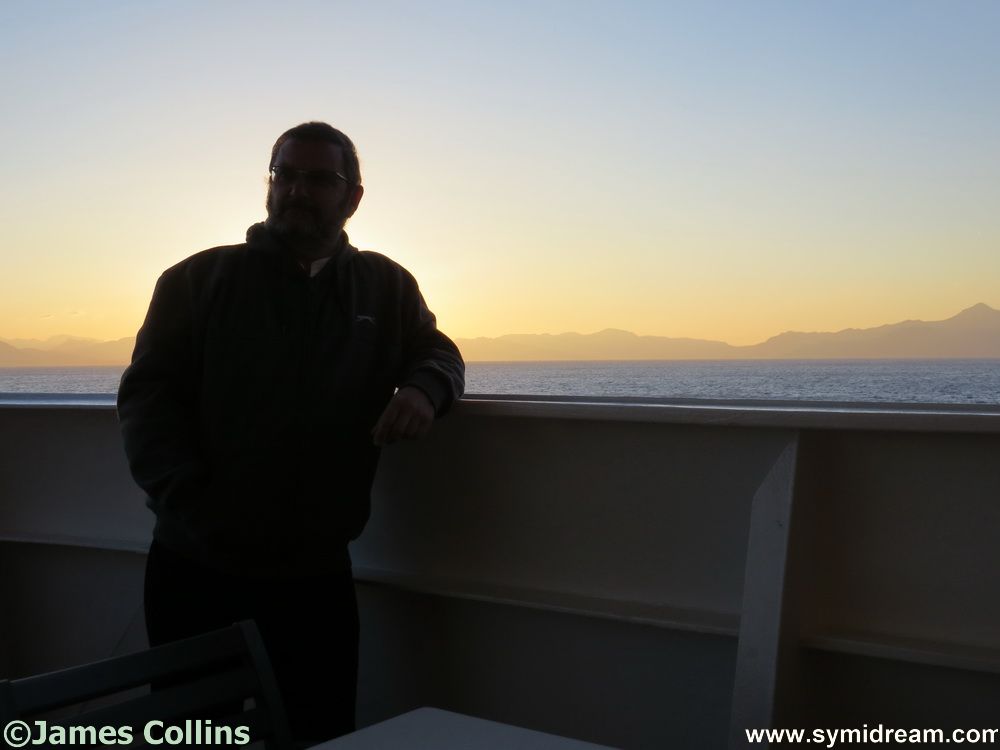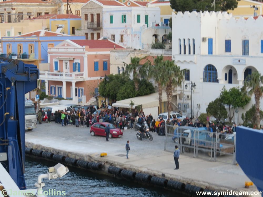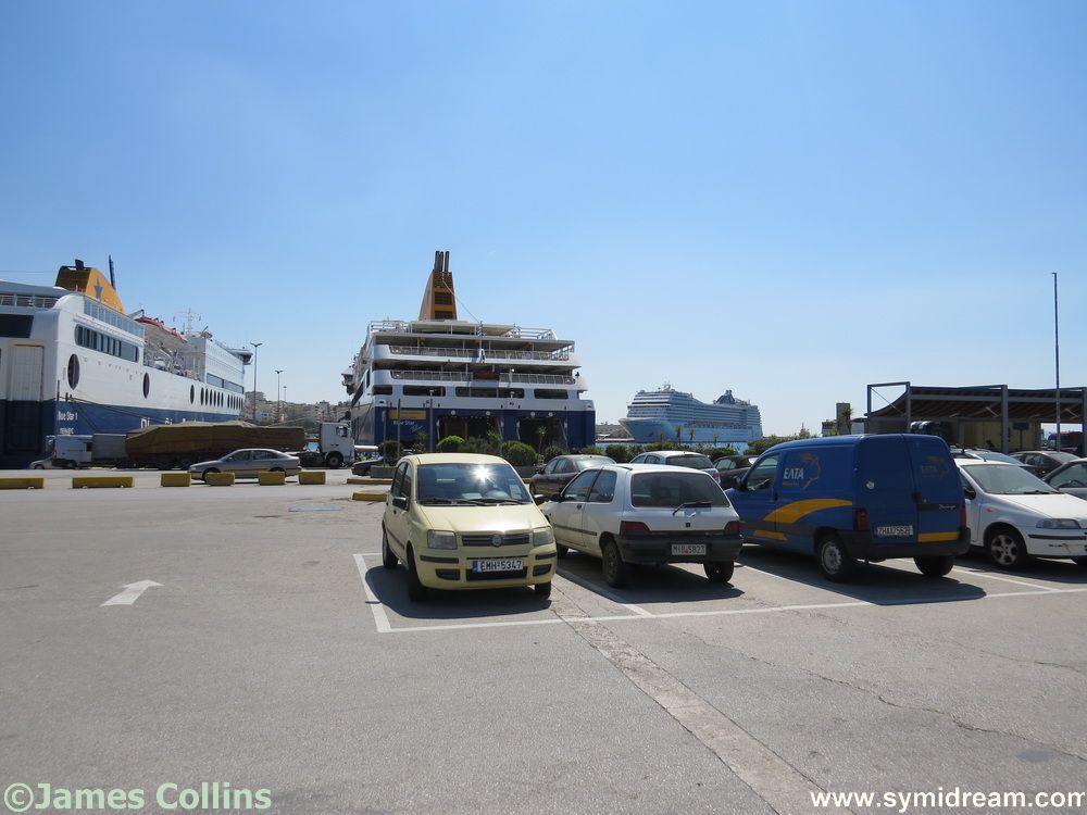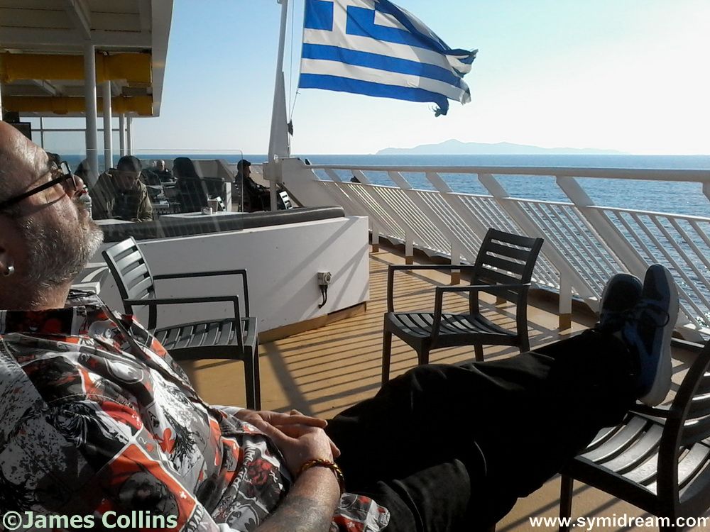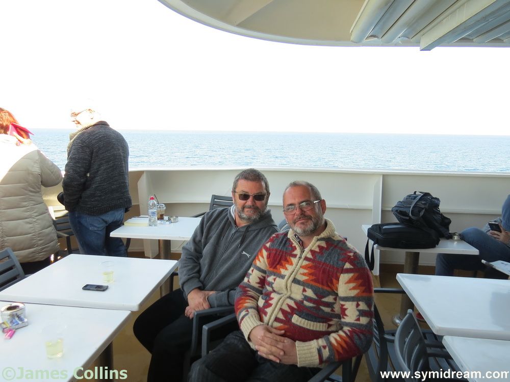 Cabin sorted, we went to watch the ferry load from one of the stern decks. There are a couple of these, plenty of outside space and a bar. The boat left late due to the amount of loading going on, and we spent an entertaining two hours watching it all. We were in no hurry but, as it turned out, the boat made up the time, and we arrived on Symi on schedule. Well, it is all downhill. A very nice young chap from Rhodes offered to take our photo together, which you can see here among the many others, and it turns out his girlfriend is from Symi, but he was going straight on to Rhodes.