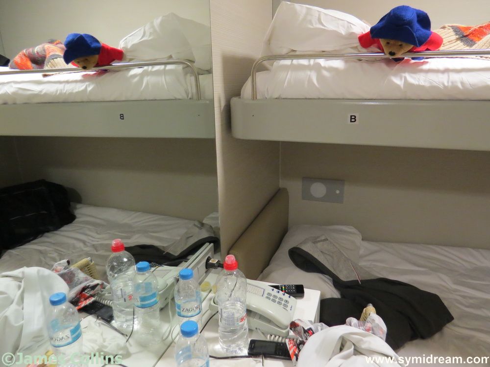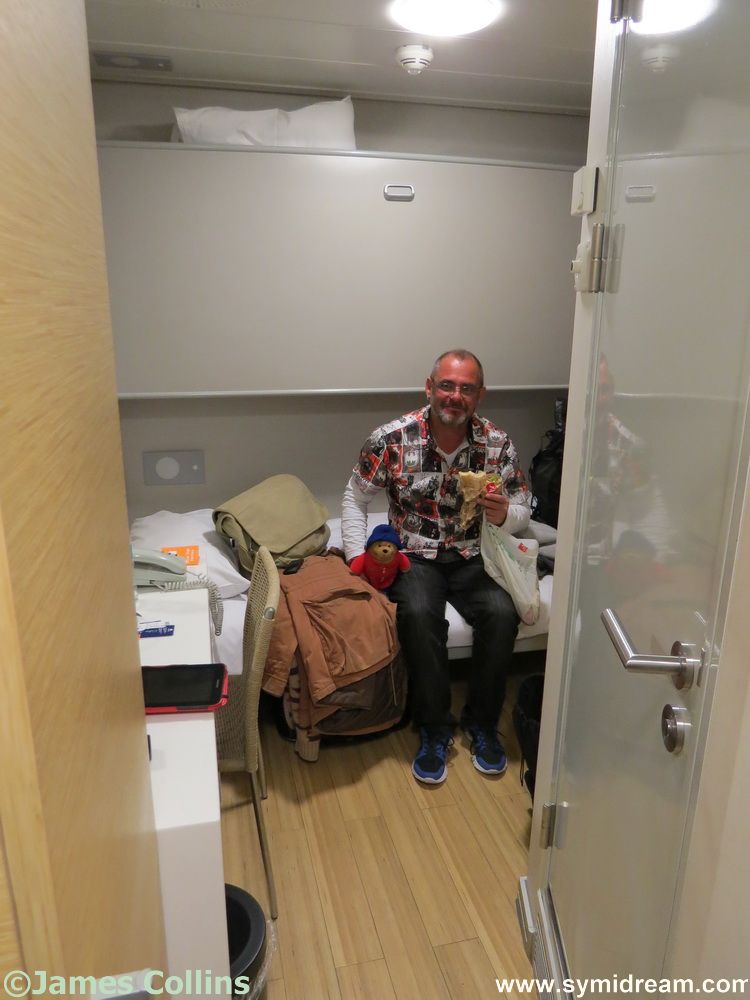 There are various kinds of cabins, but we had gone for the cheapest, a two-birth (bunk beds), internal, and the combined cost for us two was €170.00 for the 16.5-hour journey. Now then, had we gone by plane, the cost would have been about the same if not more. Plane tickets (€60.00 each including the tax and luggage etc.), transfer to a hotel in Rhodes (minimum €2.50 each, or a taxi for €25.00), an overnight there, (€25.00 to €90 depending on where you stay) and the boat across to Symi (€16.50 each) – I’m educated guessing at those prices and adding them up at the lowest price, you get to €183.00 – so that’s the money side of things taken care of. What about the boat?