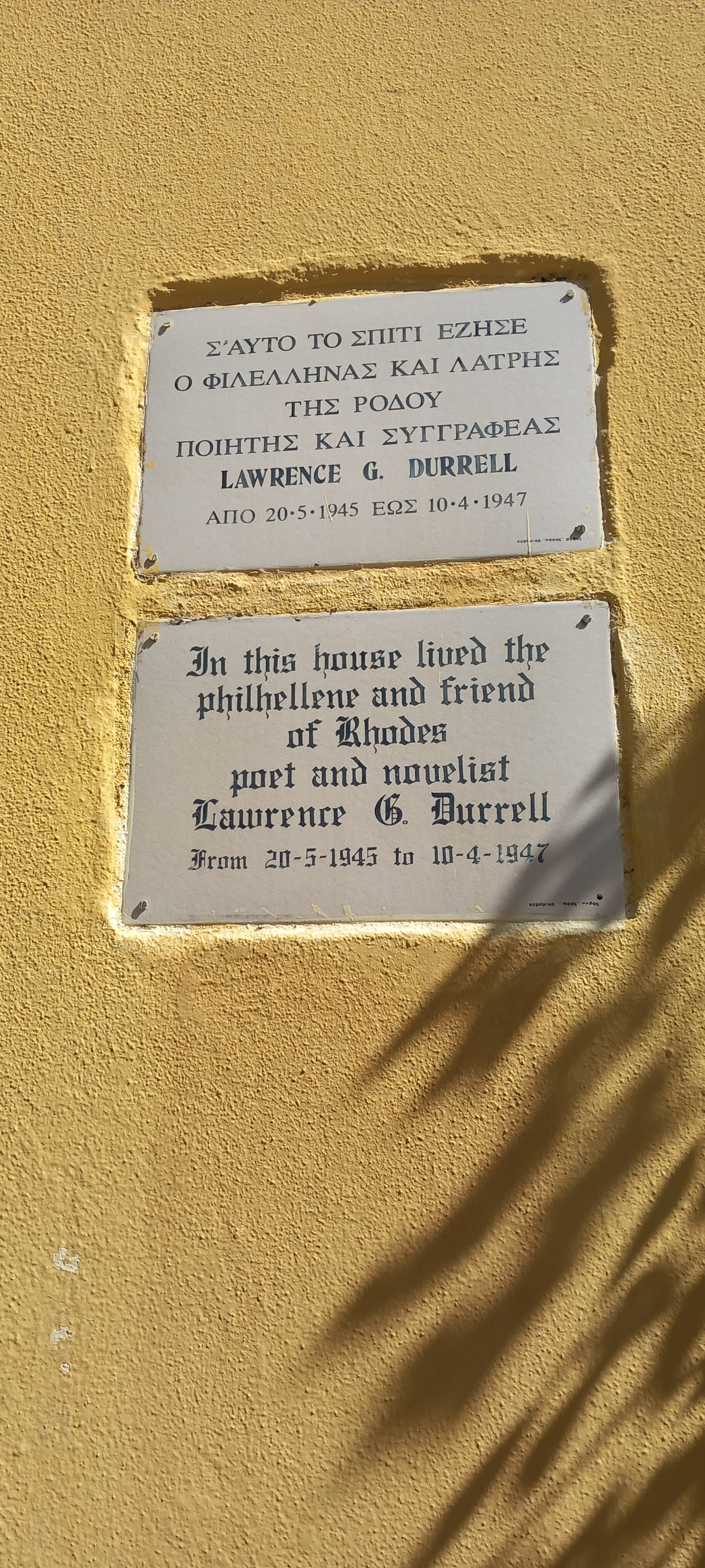 The Lawrence Durrell House (Villa Kleobolus) is a little villa by the old Turkish Cemetery and the Mosque of Reis, right next to the Casino. It has also been described as the gatekeeper’s cottage, which it may have been, and it’s right on the edge of the road, so easy to view. Durrell was there from 1945 to 1947 and was working for the British government because Britain was overseeing the Dodecanese for a while following WWII. The British administration was using what is now the casino, so the villa/cottage was handy for work. As Information Officer, he supervised the publication of three daily papers, in Greek, Turkish, and Italian.