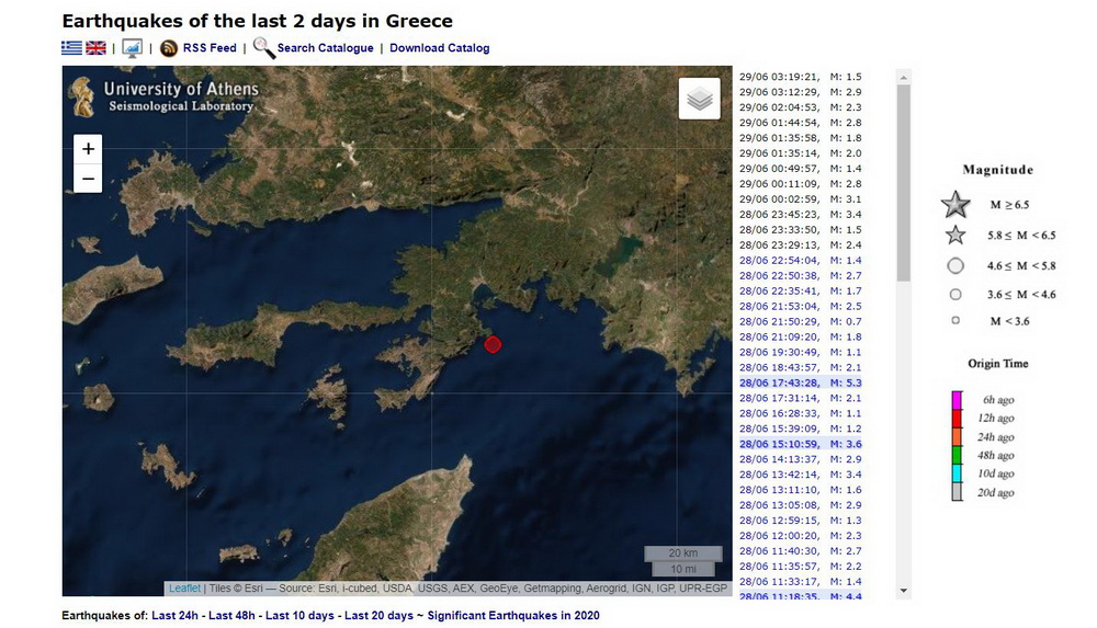 It turns out this was a magnitude 5.3, centred 30.9 km NNE of Rhodes at a depth of 64 km (University of Athens), and you can see the placement on the map above.