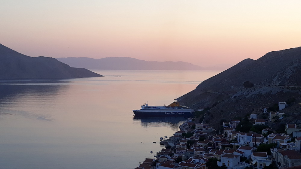 Also moving about over the weekend was the Poseidon, running a couple of trips with fewer passengers due to regulations, and taking tours around the island, which was a welcome break for some. The boat was out again on Monday morning at 4.30 to take worshipers to Sesklia for the feast day St Peter and St Paul, to whom the small chapel there is dedicated. The photo below was taken later than that when the Blue Star came in. It’s difficult to capture the exact colour of the sea and sky on my phone camera, but hopefully, you have an idea of the tranquillity of the scene.