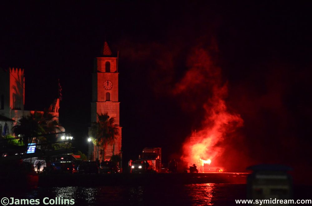 Later, having a glass at Pacho’s, you see a red flare being set off and wonder if that’s got anything to do with incoming refugees. It doesn’t, on closer inspection, seem so as the person holding it was on the quayside. The Dodecanese catamaran was leaving so maybe someone was saying goodbye in style. It did remind me though of a time in the summer when we were on the balcony and saw a flare, red, over by Nimos which did turn out to be a refugee boat in trouble. Red flares in the sunset.