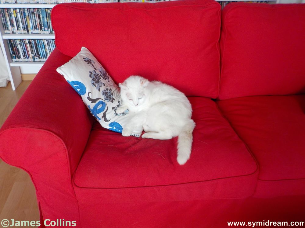 White cat, settling in on the blue cushions donated by Red magazine