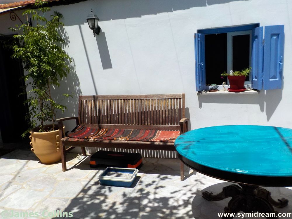 The cat’s outdoor bench and bathroom facility (which is usually under the table)