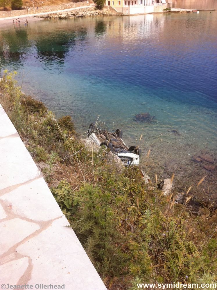 The top Symi story of the weekend was the car that overturned on the Nimborio road and ended up upside down in the sea, with no great injury it has to be said. And here’s a shot thanks to Jeanette from Nimborio. It’s a reminder to us all to wear seatbelts. It might not be a long way down at times (though at other times there are long drops) but if you got thrown out of your jeep or car and rolled down the rock, there wouldn’t be much left of you worth taking a selfie of. And people who ride motorbikes, it’s quite simple: wear a crash helmet or suffer brain damage. Yes it’s hot, but so will the concrete be when your skull scrapes across it, to say nothing of your arms and legs. I used to ride a 550cc around London, and out into the countryside, and there is no way I can get on a motorbike now without a helmet and proper leathers. So I don’t.