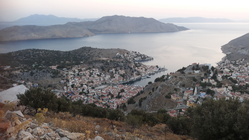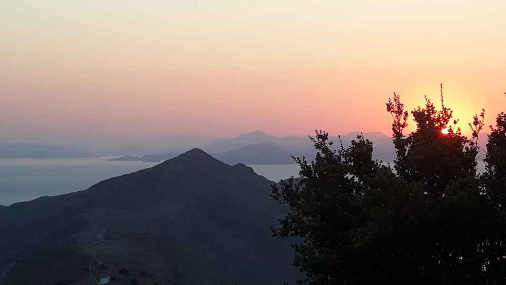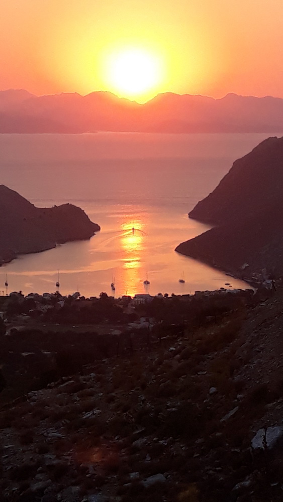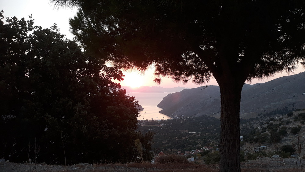 Yesterday’s walk, for me, was again up the hill following the main road, and this time, I went all the way to ‘picture corner.’ This is the place where the tourist buses stop so that people can get out and take photos overlooking Nimborio bay, Yialos and Pedi. As usual, the sun was coming up, so there are the same-old images, but from a slightly different altitude. Also, when looking at Yialos, you find the scene is bathed in grey light rather than the bright red and orange that the Pedi valley has at that time of day.