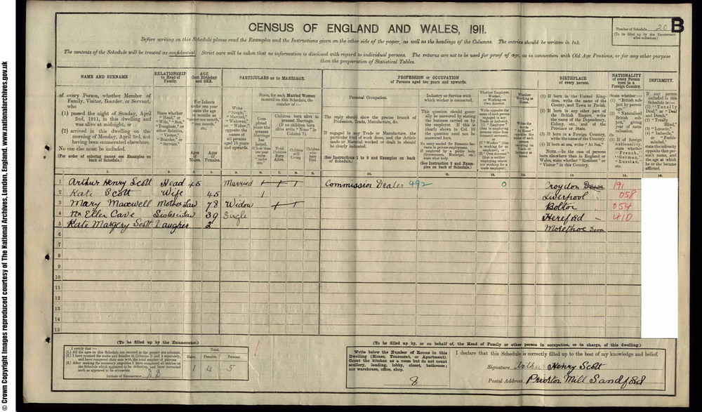 As Ellen Cave appears as a ‘sister in law’ on the 1911 census I have added a separate column for her. She was obviously involved with the family but we don’t know exactly how. Maybe the ‘sister in law’ is a complete red herring, but tracing her through the census may bring some clues to light. She is one of few people documented along side AH Scott after all.