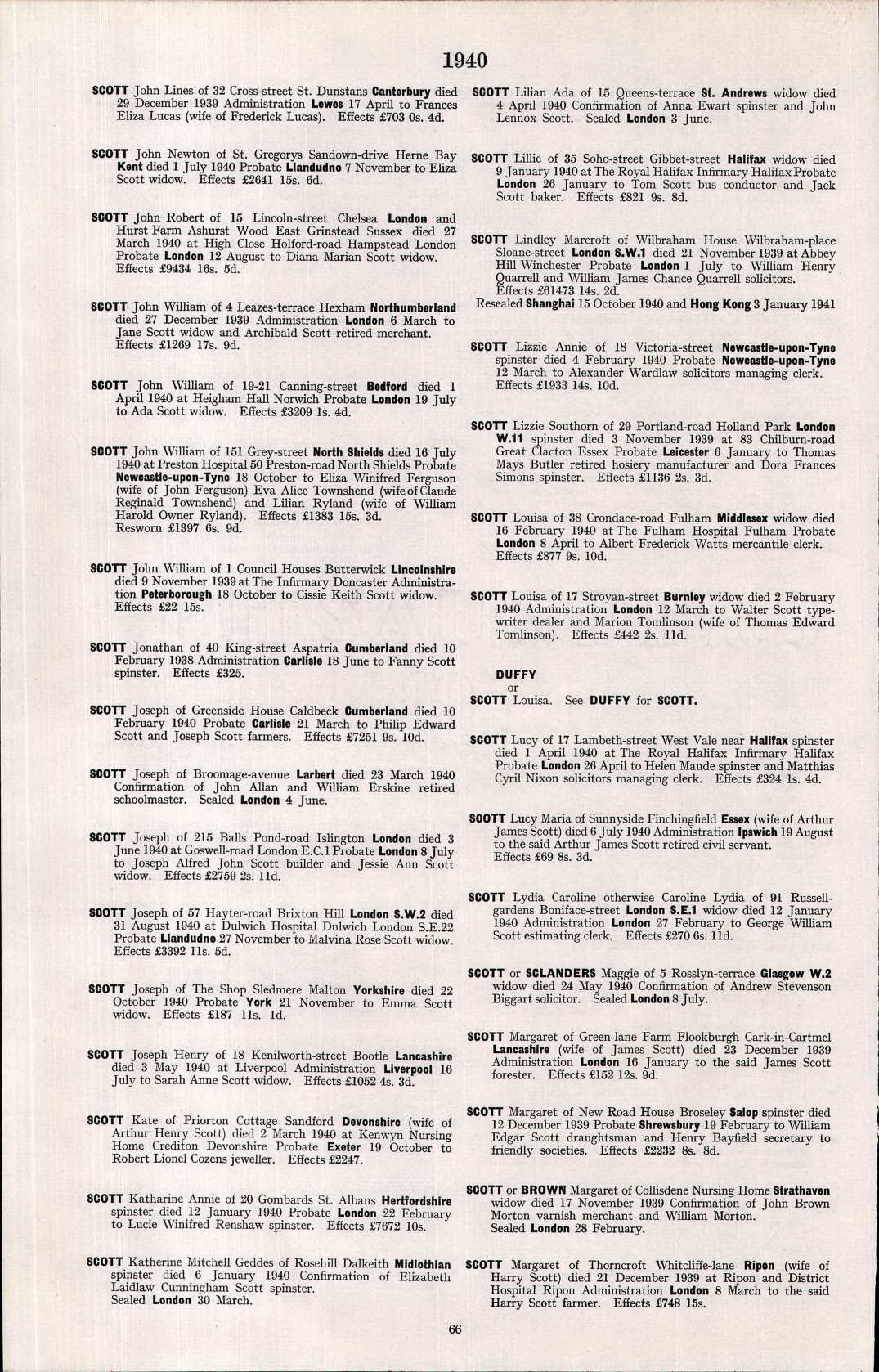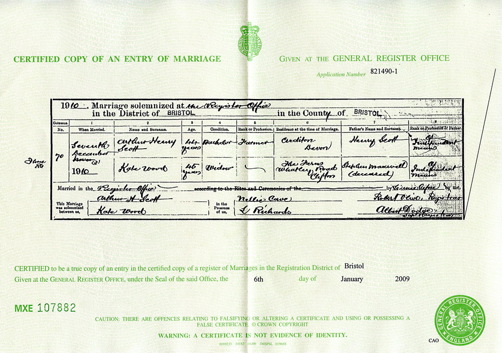 Kate Scott probate: Scott Kate of Priorton Cottage Sandford Devonshire (wife of Arthur Henry Scott) died 2 March 1940 at Kenwyn nursing home Crediton Devonshire Probate Exeter 19 October to Robert Lionel Cozens jeweller. Effects £2247 |