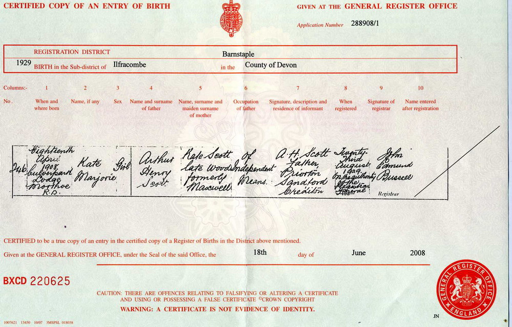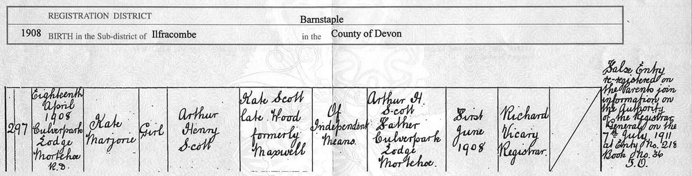 The only difference here is that Scott’s address is now put as Priorton, which he did in fact own when his daughter was born. He still remains as if married to Kate – which he wasn’t when Kate M was born. Why register the birth a third time? Is it to do with the up-coming wedding? |