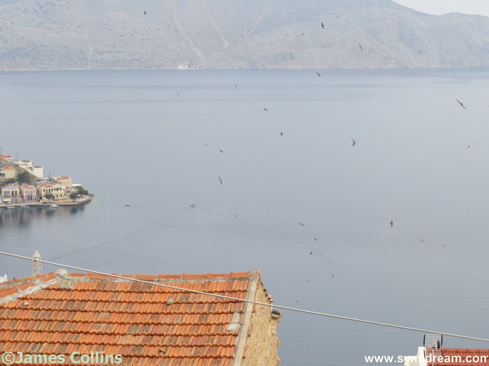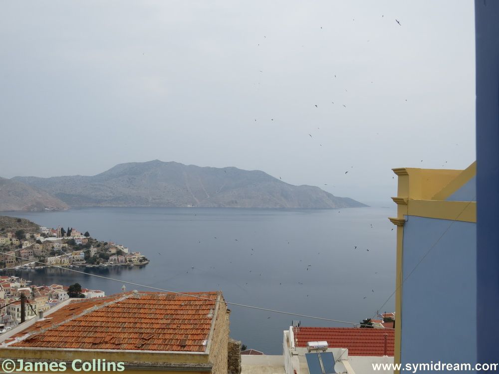 That used to happen at the old house where we had a couple of families of them living in the roof. One or two days a year, in April, I would have to leave the saloni where I worked and keep the doors and windows open while the things descended from the ceiling and took over the room. An hour later and they were gone, leaving behind a covering of tiny wings. So, the dots you see in these photos are actually swallows (or martins) on their way to somewhere, stopping off for lunch on or above Symi. There are still some around mixing with our usual neighbours, the sparrows, pigeons, a few seagulls, some ravens from time to time and, again at this time of year, a few hawks.
