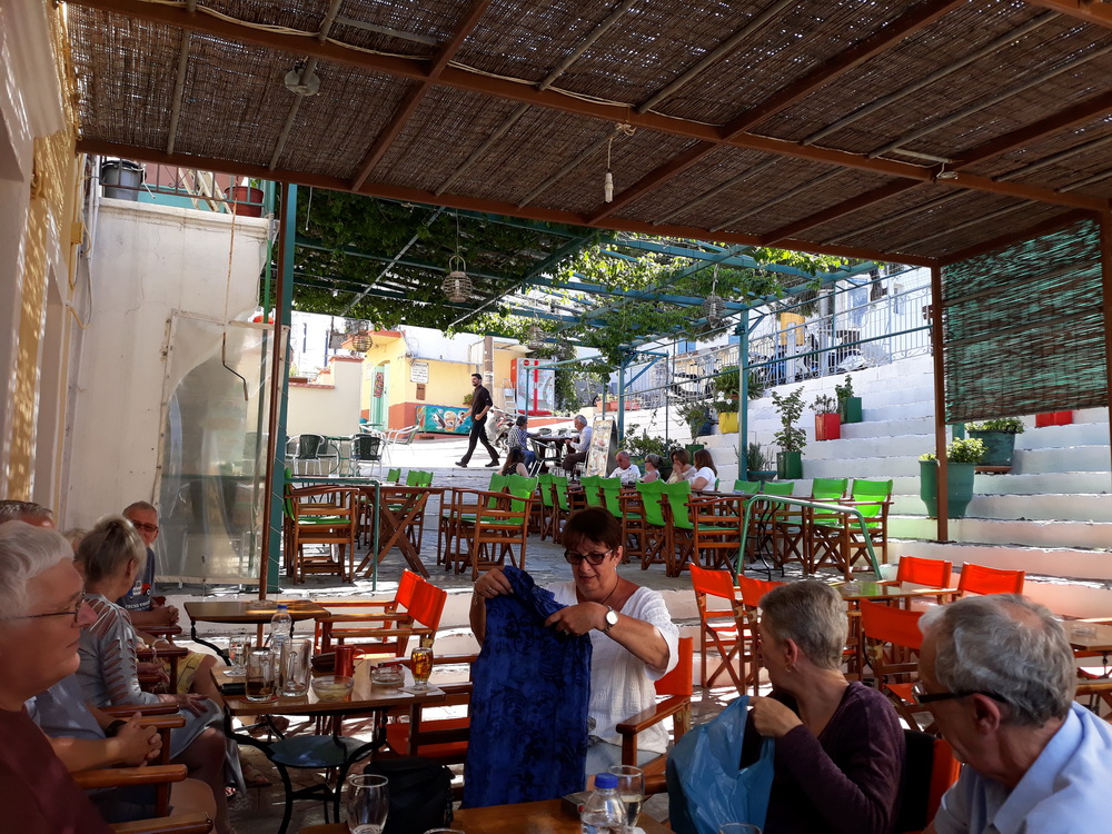 Today, a few photos showing recent action in the village square. Well, when I say action, I mean… You know, daily life. The bars starting to busy up as summer gets underway, Symi and our mayor on the TV on Sunday night, someone taking their young garlic for a walk in the pushchair… You know how it is.