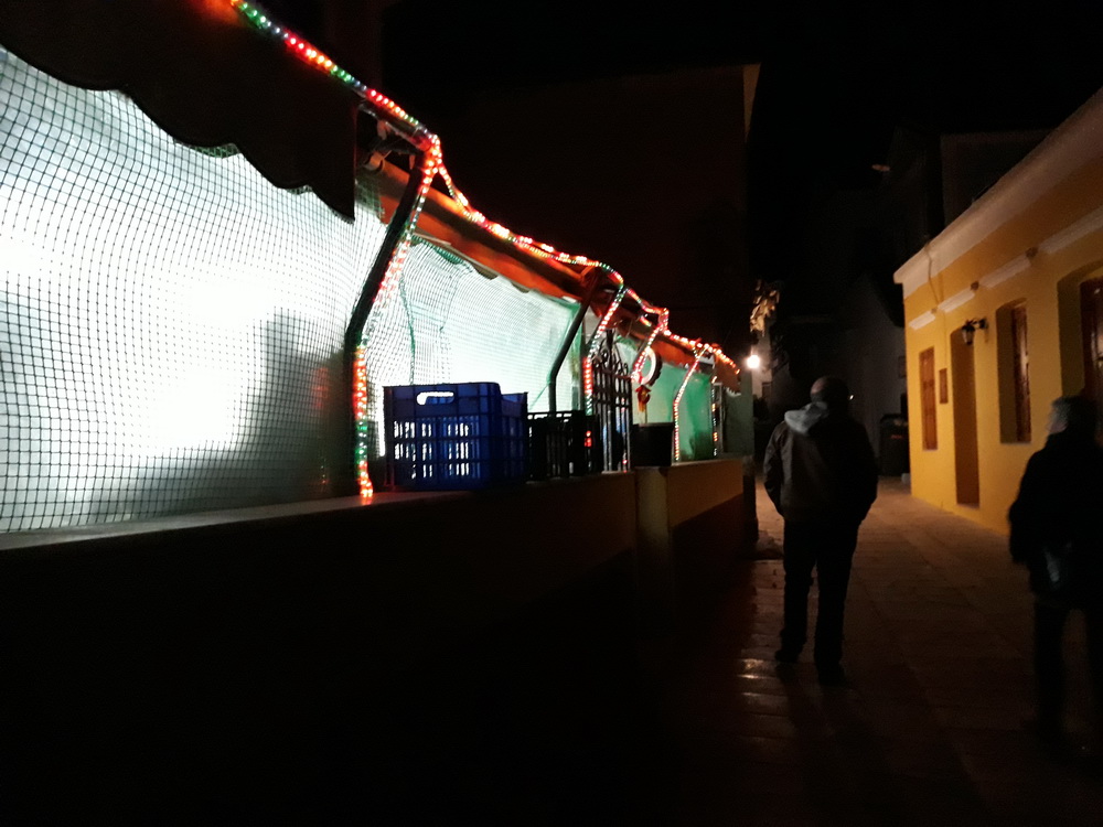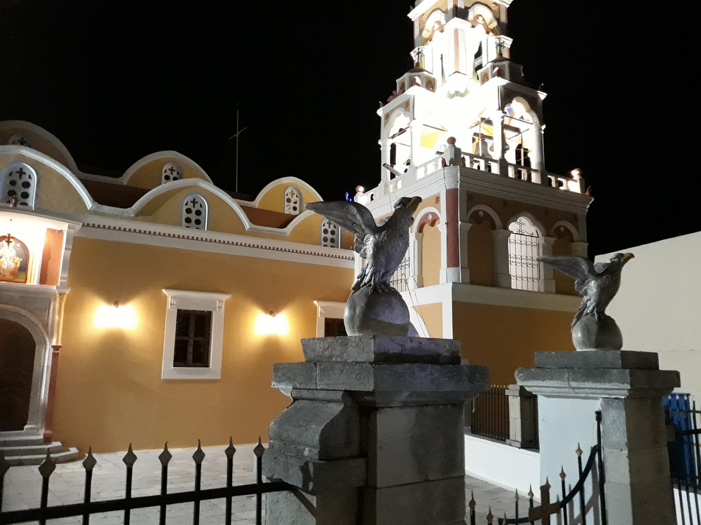 Well, not all of Symi by night but a couple of shots from over the weekend when we were out and about after hours. Coming back from Upper Horio and passing the church of Ag Athanasios where there are new eagles crowing the gateposts, and lit up from the outside, coming back from the Sunrise on Sunday night, past the supermarket looking mighty festive as always, and the village square on a not-too-chilly night in January.