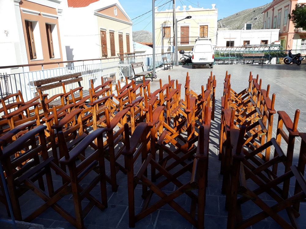 Here are a couple of shots from the village taken the other day. The chairs in the square came from Lefteris Kafeneion and were, I guess, out there for varnishing. The weather is warming up, and so it’s time to change the winter café chairs for the summer ones, hence the work. Having said that, it did rain a little on Wednesday night, but not for long. Not long enough to water the plants as far as I could tell the following day.