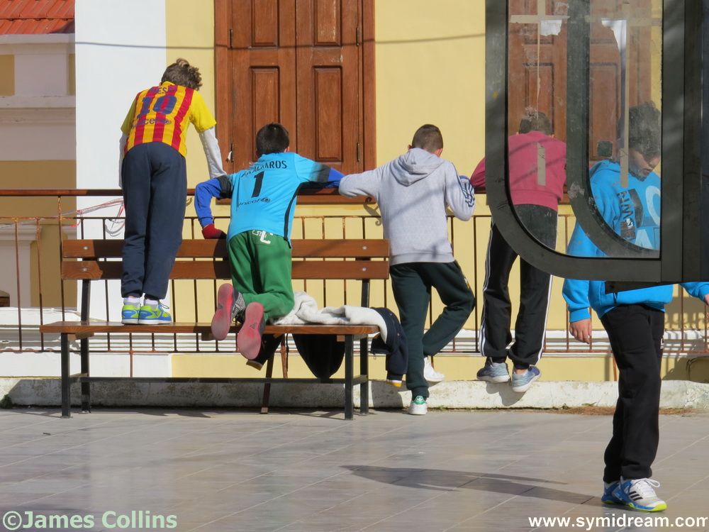 I went out for a very short walk on Sunday, mainly to see what was going on in the immediate neighbourhood and to try and get some photos for you. This is real Symi in the winter stuff: the cat having a wash on the roof, children playing football in the square, the occasional cat wandering around and following me… and very little else.