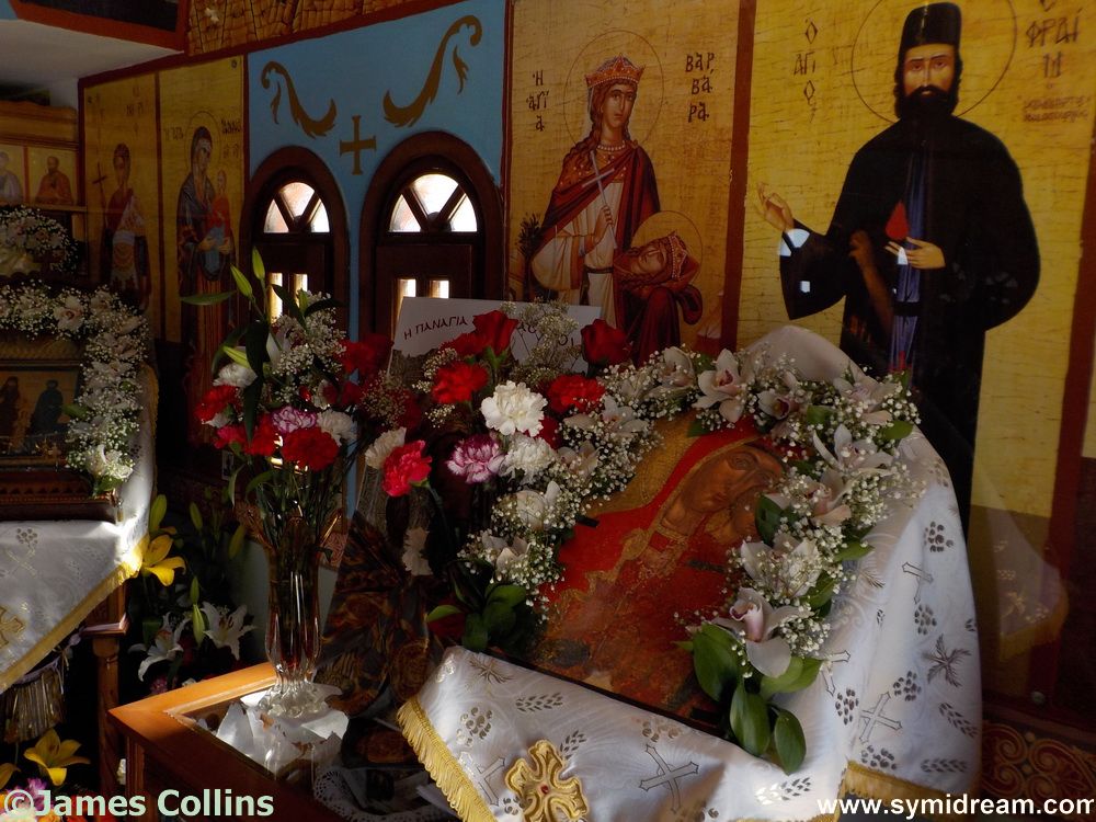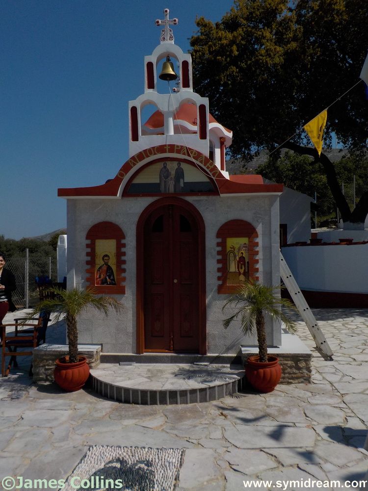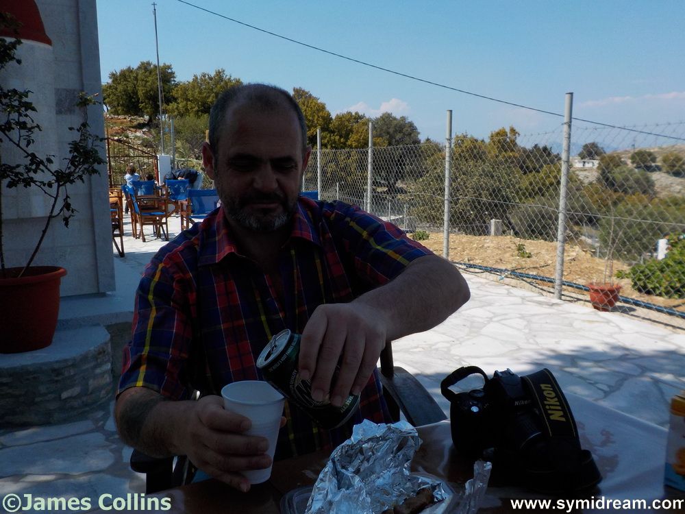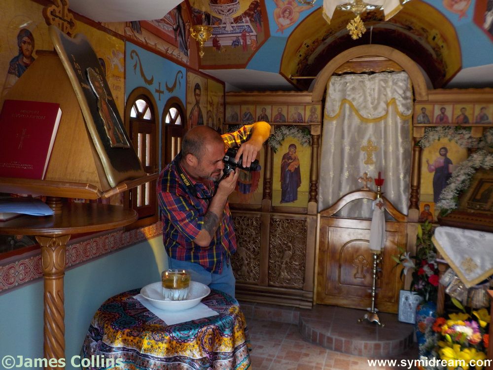 I left you overnight at the small church of Ag Raphael. It was here, while on our healthy, afternoon walk, that we were invited in to take photos and join the name day festivities. We celebrated our health-walk with a beer and donuts. Actually, we didn’t eat the donuts there, we took them home, but we did have a souvlaki. It is rude not to. We also took some photos inside and around the church. Here are a few:
