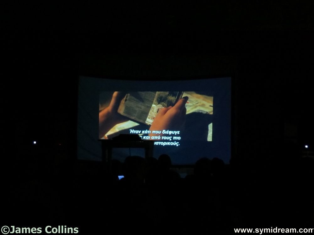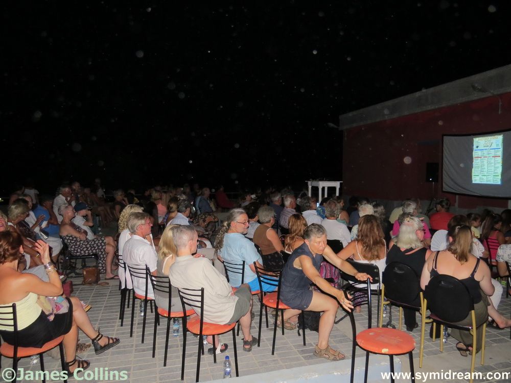 We estimate that there were around 150 to 200 people in the audience, so it was a great turn out. It’s also a good venue for films (though they might need more chairs) as there is enough room for lots of people, there are facilities nearby and, in the summer, it’s good to be able to sit outside under the stars. There was very little interference from traffic noise if any, and the whole thing went off well. Bravo the Symi Gallery Cinema organisation for putting it all together.