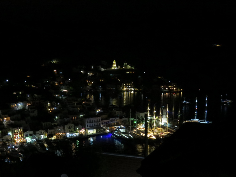 I also get to hear more natural sounds and see some sights. The owls are regular background noise and last night while sitting outside we saw a barn owl flying overhead. I know it was a barn owl (there is a pair nesting somewhere in the village) because, well, I was once a young ornithologist and a barn owl is a barn owl. We also occasionally see the bats and little owls flying around the house, the occasional rat on the ruin wall, cats of course, and sometimes young people trying to get home in a straight line, taking a shortcut past the front of the house, following the torch of their mobile phones with varying degrees of success. And then there are the lights from boats and buildings, and the mysterious rising light over Turkey (must be some kind of weather balloon as it goes up in a straight line, waits, and then come down, fading as it descends). There’s plenty to see and hear on Symi even during the wee small hours.