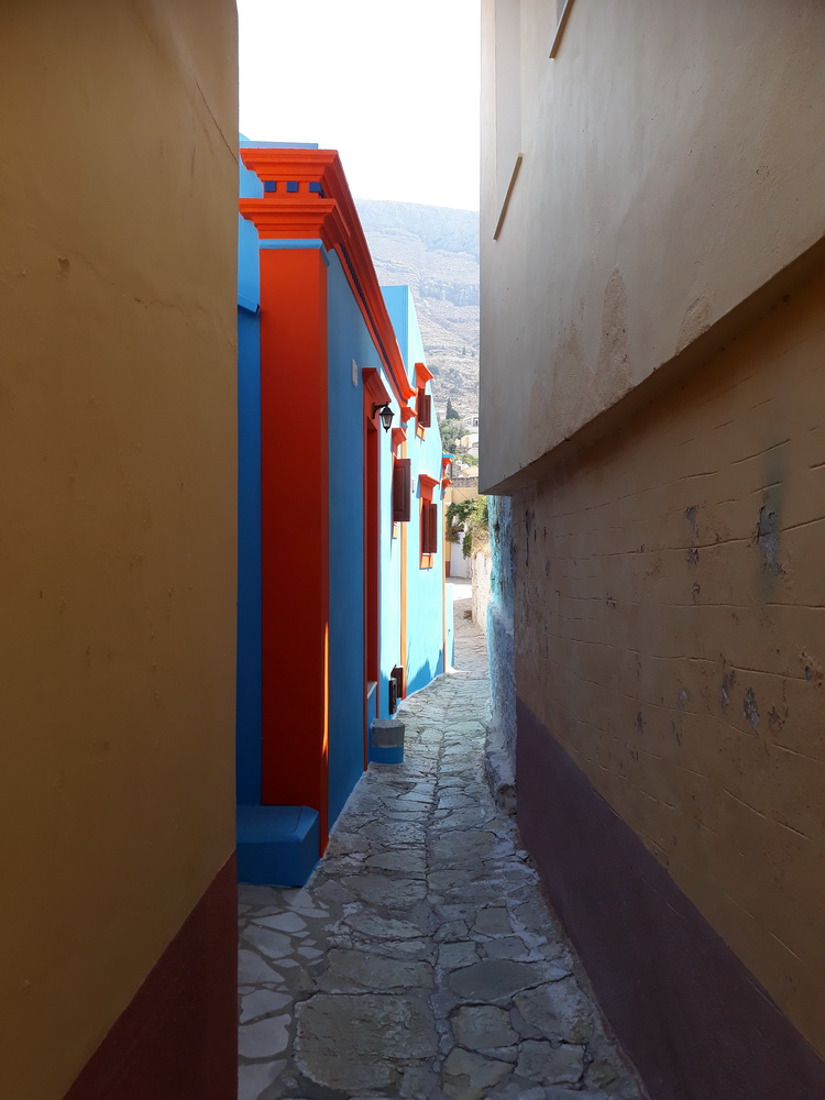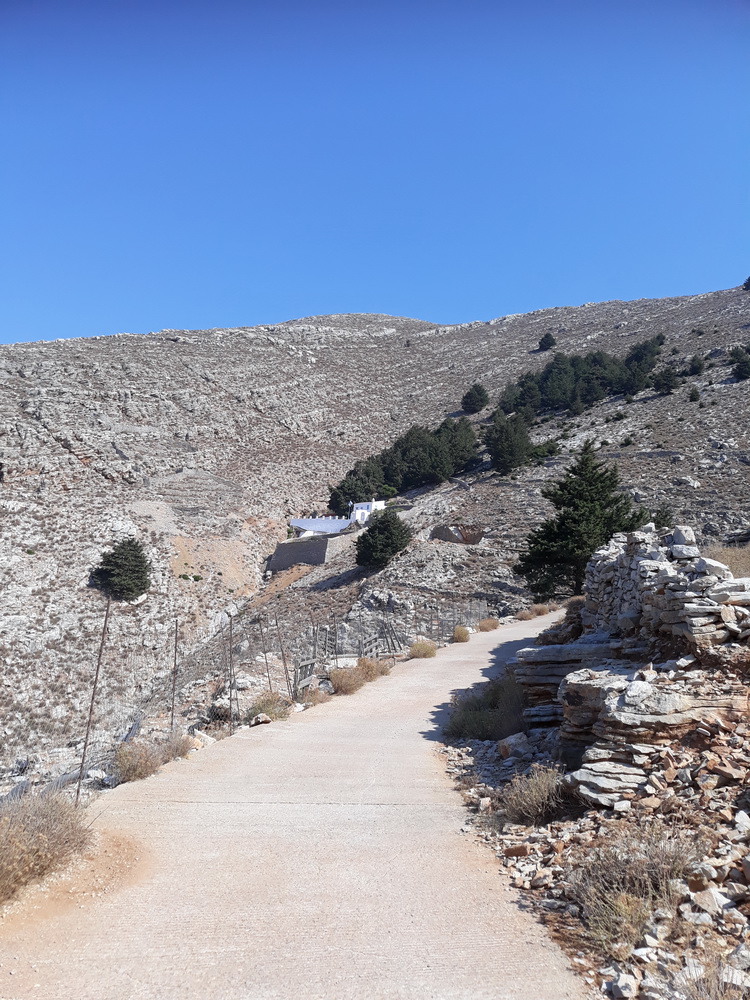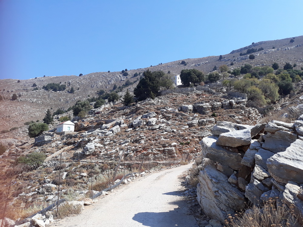 I came out by Lavinia Studios, the place I stayed at on my first visit to Symi in 1996. Sadly, they now look a bit delipidated, and I don’t think they’ve been in use for a while. When I was there, there was no building right in front of them so there was an uninterrupted view down to Pedi. Anyway, past there and up the hill past the cantina to the Agia Marina church and cemetery. Past that to the bridge and the yappy dog (absent) and onto the concrete road that winds up to To Vrisi, as it’s known locally. It means ‘the tap’ because there is a natural spring beneath and you can refill your water bottles when you get there.