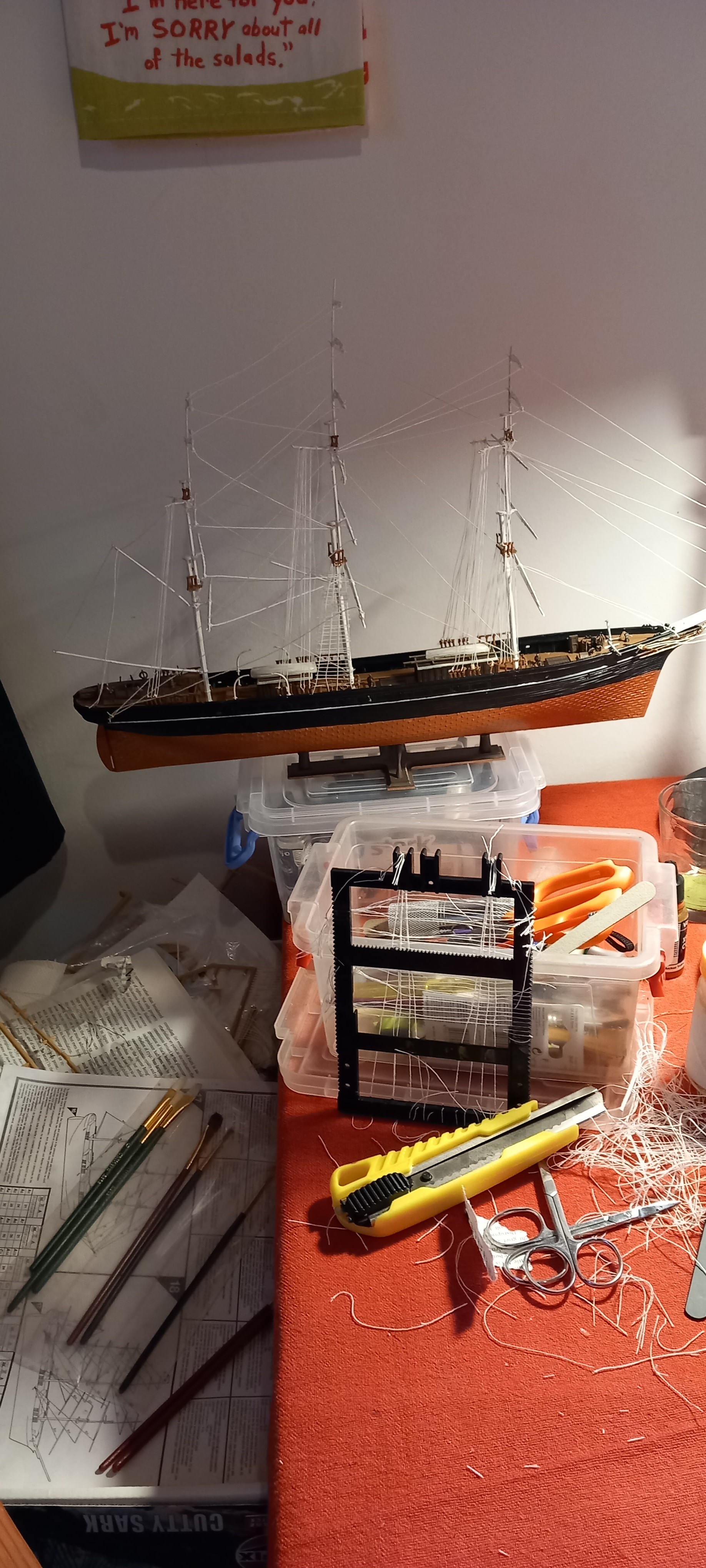 You know how I was wittering on about this model-building season? Well, my Cutty Sark is more or less finished, just the sails to put on, which I will do on Thursday. However, you might remember that H had finished his Porsche, all bar the damaged windscreen which the model shop in Athens is ordering for him. Meanwhile, I ordered him a motorbike on Thursday afternoon, the shop rang on Friday to check if it was okay to replace one make of paint with another, and yesterday, Monday, the Symi post office rang me to say I have a package waiting. I mean, that’s pretty good going, so bravo Elta Courier and Fasma Models. As H is starting on his Yamaha on Thursday, I will be starting on my Atlantis reissue of the Aurora Phantom of the Opera (glow in the dark). I already have one of these built and on the shelf, but this time, I want to experiment with some tiny lights I bought from Temu. Watch this space.