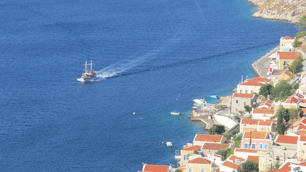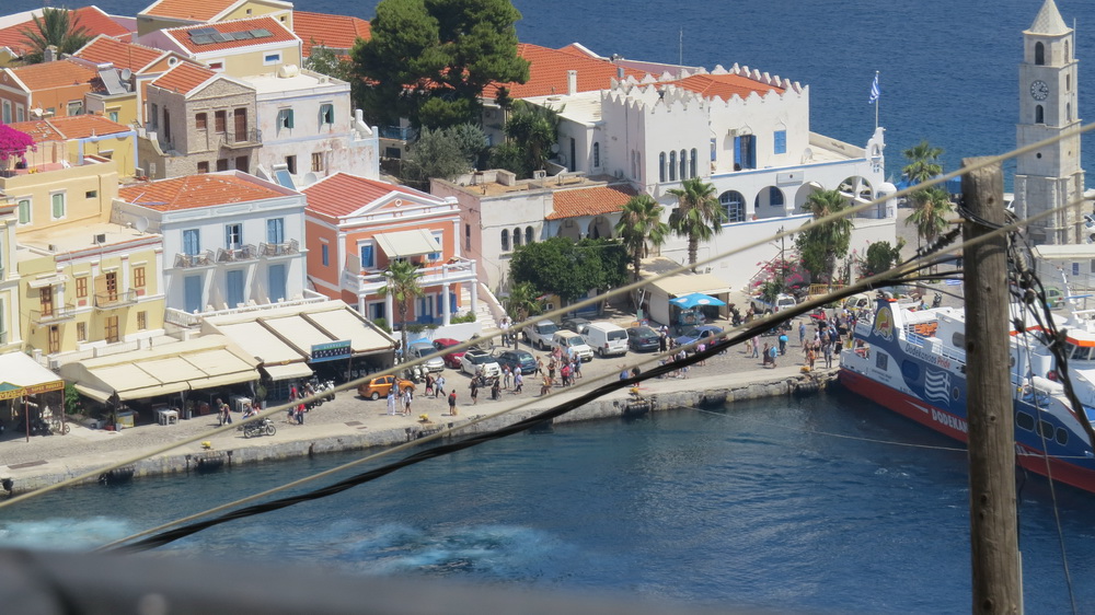 While I’ve been beavering away writing my usual one chapter a day, the world outside is gradually beginning to turn again. I popped out for an after-work glass of wine on Sunday evening and noted a few visitors in the village. There was a wedding at the weekend, with bells from Agia Triada and other churches, girls dressed in white carrying flowers, and, possibly, visitors over for the day or weekend especially for the event. The Dodecanese catamaran came in on Sunday in the late morning and tied up for a couple of hours, then left, then returned again later before leaving in the evening, and when it first came in, quite a few passengers came off it. I happened to be on the balcony, and feeling like a classic nosey neighbour took a shot through the telegraph wires.