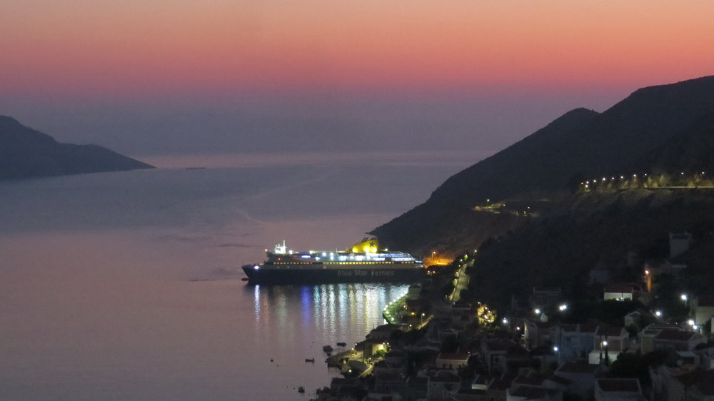 A plane also flew low over the island (on Saturday or Sunday, can’t remember which now). It wasn’t a large plane, more like a Cessna-sized one, and I saw it fly from Nimborio way, across Nimos and off to wherever. I’ve never seen that before. The Blue Star came in early on Monday morning, and there was quite a procession of vehicles heading down to meet it at five. It’s always a majestic sight to see as it glides in relatively quietly on a flat calm. After a hot and humid night, the dawn chorus was already underway with cockerels, owls, and barking dogs.