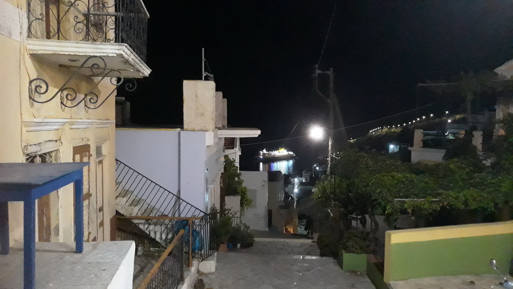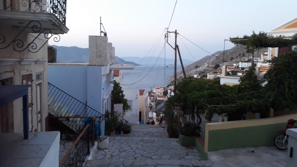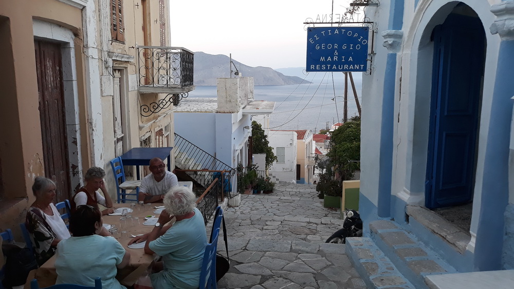 On Friday, we went out to dinner for the first time since March. Taverna Maria & Georgos was open, serving lunch to a party who came over for a baptism at Panormitis. A few of us ‘booked’ a table for the evening, and sat outside on the steps at the top of the Kali Strata. It was a bit odd sitting outside the old butcher’s shop, now supermarket storeroom, and not in the traditional pebbled courtyard, but that was the choice of our hostess, and the taverna has been putting a table or two our there for a couple of years now. Nice view.