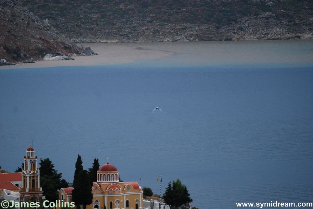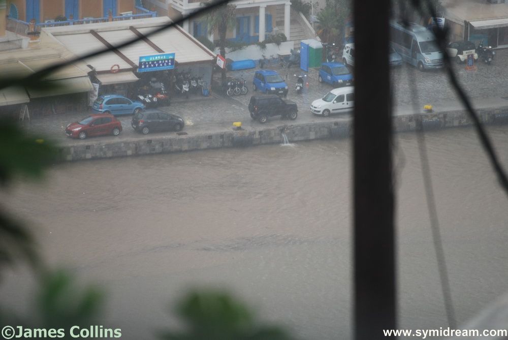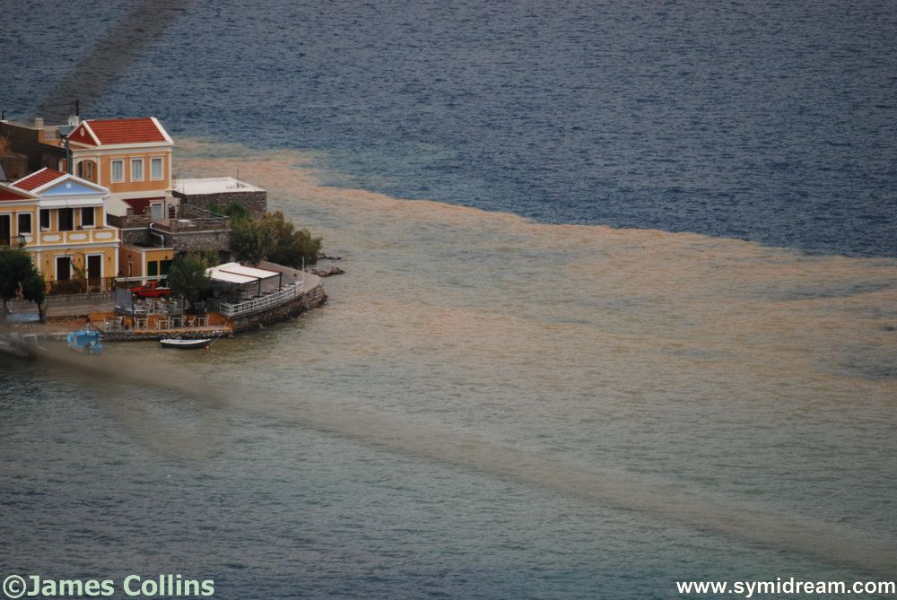 Anyway… Sometimes, when it rains on Symi it really rains on Symi. And the first real rain after a long hot summer results in the surface dust and soil being washed down the hills and into the sea. There’s always a certain amount of top soil washed away but when you get as much rain as we did on Wednesday, and after a long dry spell (one small storm aside) you can expect to see the sea change colour. So, today’s photos will give you an idea of how the sea changes when the rains hit. The sea in Yialos was, at one point, chocolate brown.