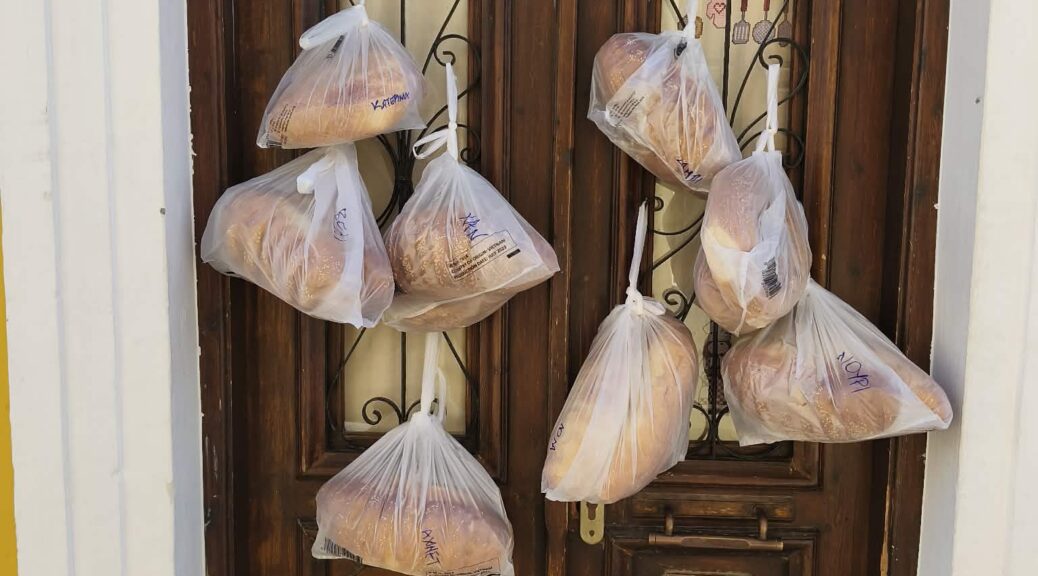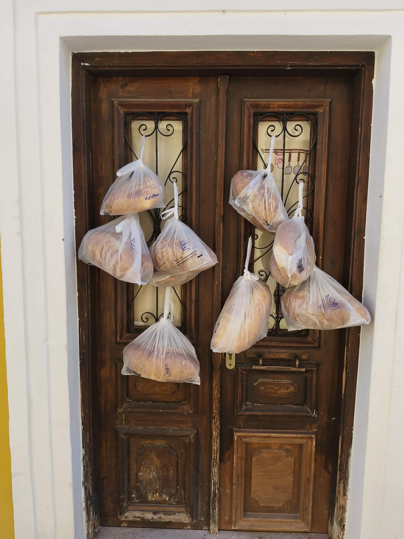 Below is a shot of one of the village bakeries. Because they close for siesta before some people can collect their bread orders, they leave them hanging on the shop door during closed hours. The bags are named, and they are never stolen. Reminds me of being in the wilds of Devon many years ago now, hiking along country lanes and now and then coming across a box of vegetables with a sign saying, ‘Help yourself,’ and an open box for ‘pay what you can.’ On the same trip, but miles away at Brookland church on Romney Marsh, there was the same thing in the porch. People’s home-grown produce, there for those who want or need to buy locally. I’m sure (I hope) it still goes on, and this is the Symi version.