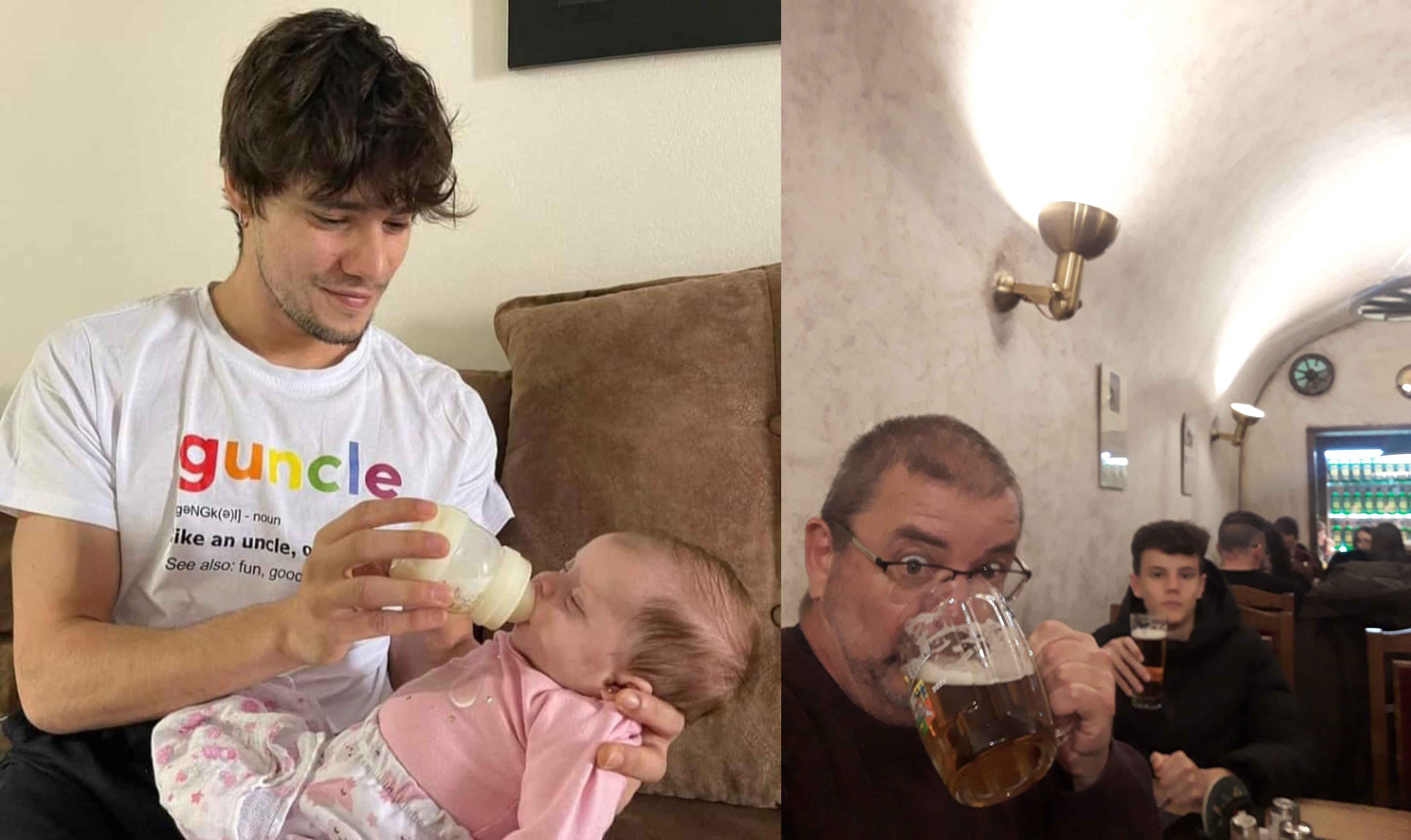 I’ll be back next week, but wanted to leave you with this… meme, is it called? Does it need text to be a meme and is it pronounced meme, meem, meam, meemee, me-me, and where on earth did the word come from in the first place? The pair on the left aren’t the same as the pair on the right (me and one of our godsons), but I put it together for International Guncles Day with the caption, It starts like this… and ends up like this. (In a restaurant in Prague, and if you want to know what a guncle is, ask a young person.)