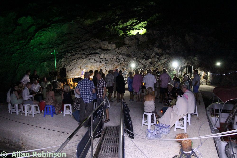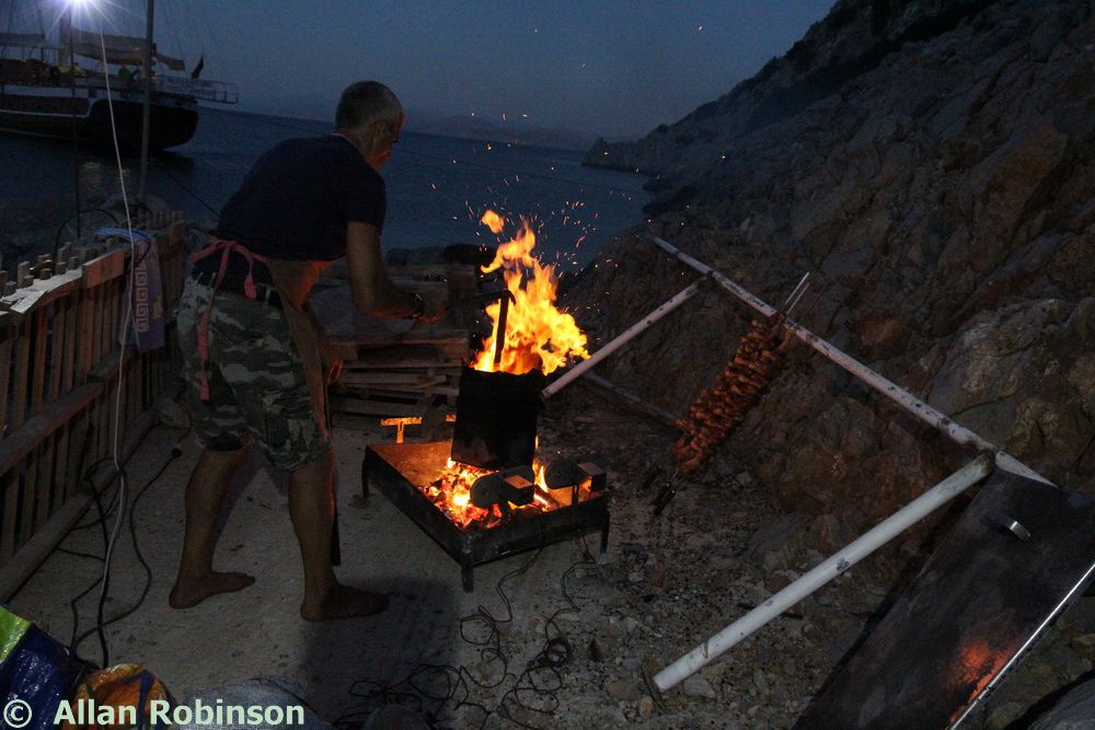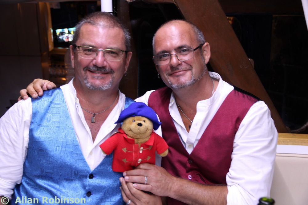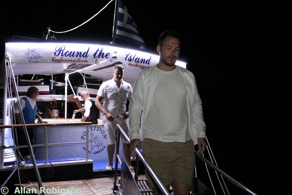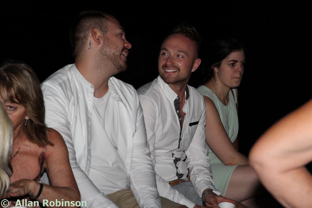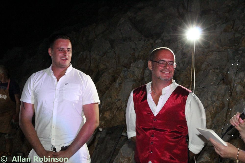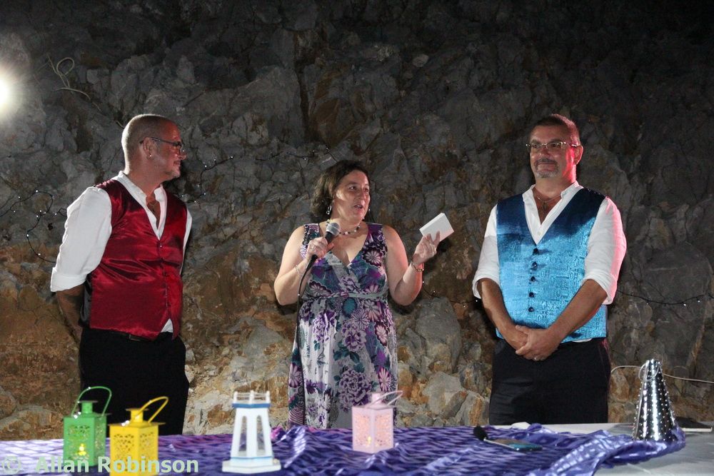 Once Steve and Terri had set up the audio and lighting system, the best men had carried equipment, the boys (Sam and Harry) had helped with arrangements, guests had taken their places, Jenine had corralled everyone into place like the goatherd herding the goats earlier, and the sun had set, we were called upon by our best men to attend our ceremony. This was a Humanist ceremony led by Jenine. She spoke wonderful words before inviting us to say our pieces to each other. Our friend, The Reverend Alun Hawkins, read a piece for us and then Neil and I exchanged rings, bourn to the table by godson Harry.