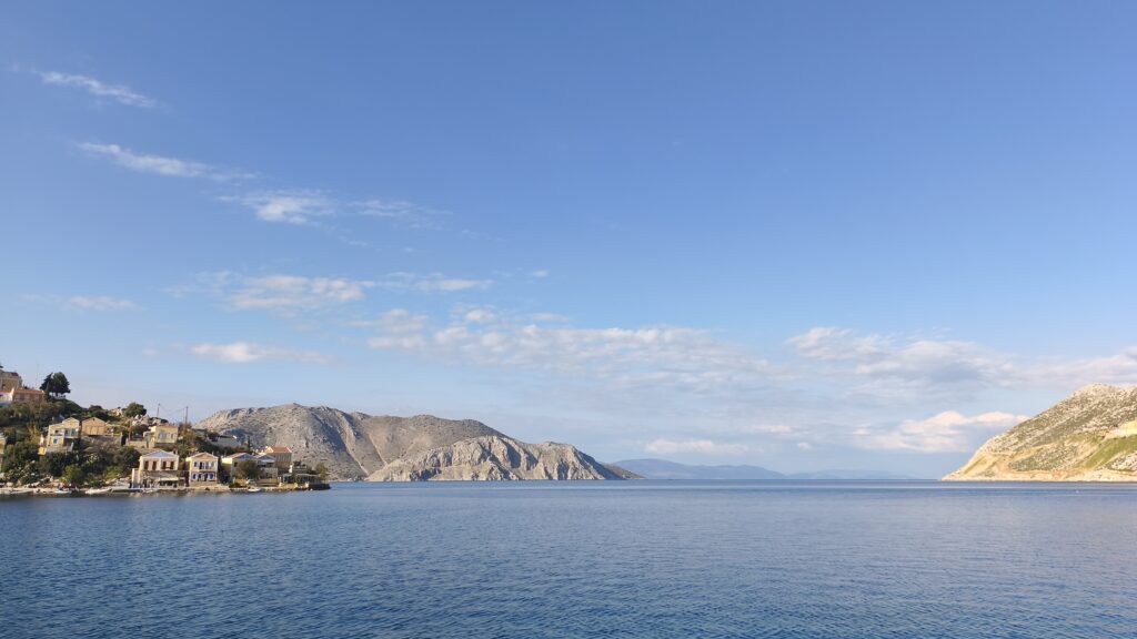 While I get my head back into gear, he’s a photo of the sea yesterday in Mandraki, to contrast with the picture above.