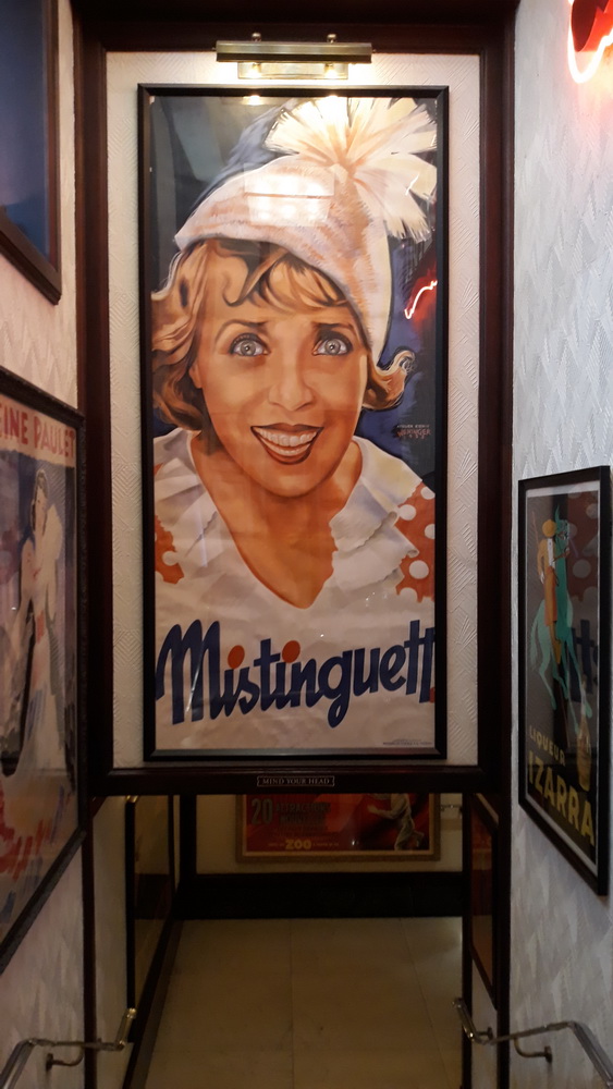 Another oddment. The bar is decorated with old cabaret posters as the brasserie is also a cabaret venue. This led me to reminisce about a godmother who had been an opera singer and chorus girl back in the sepia days. The Dowager Lady Alvingham (Auntie Dolly to us), was a friend of Piaf and also Mistinguett, and as we rounded the corner to go down to the dining room, who should be watching over us but…