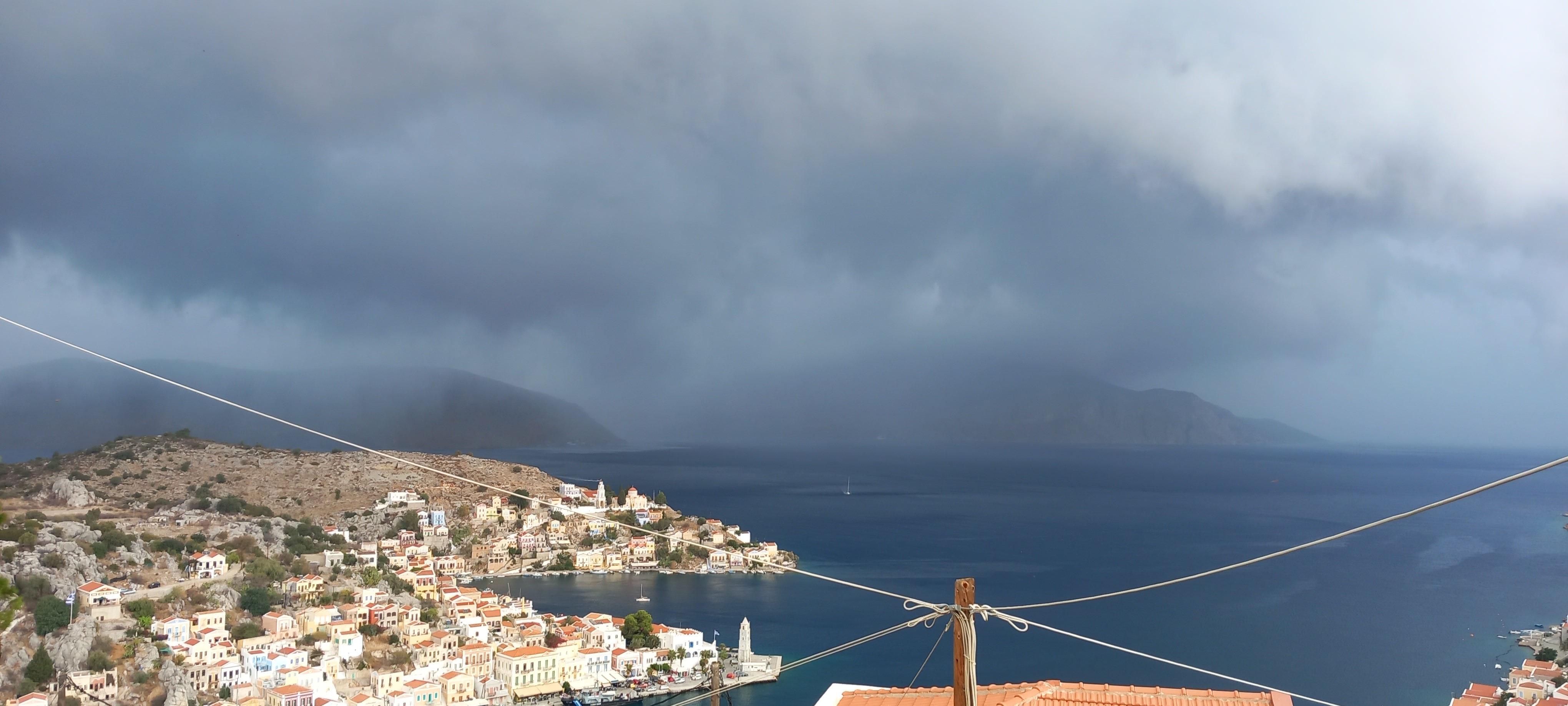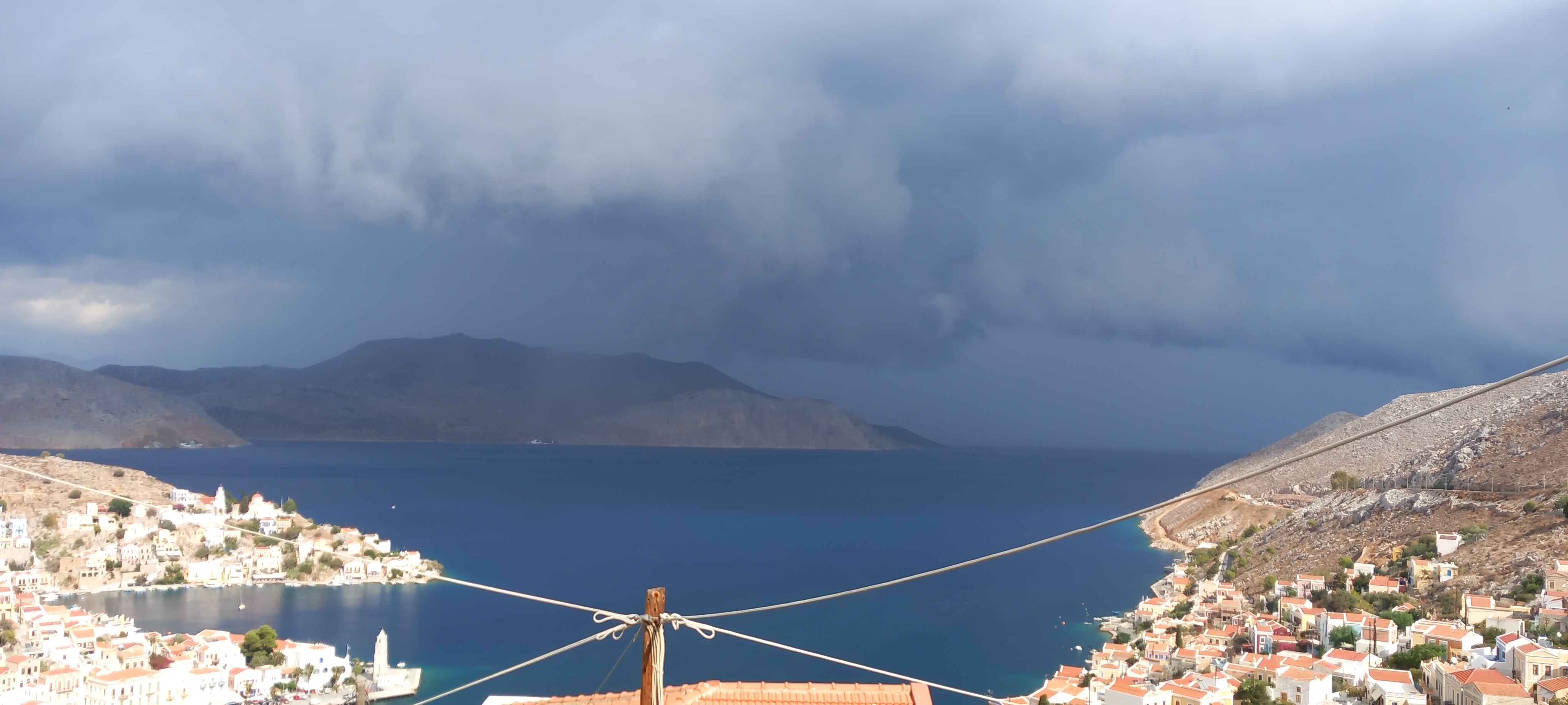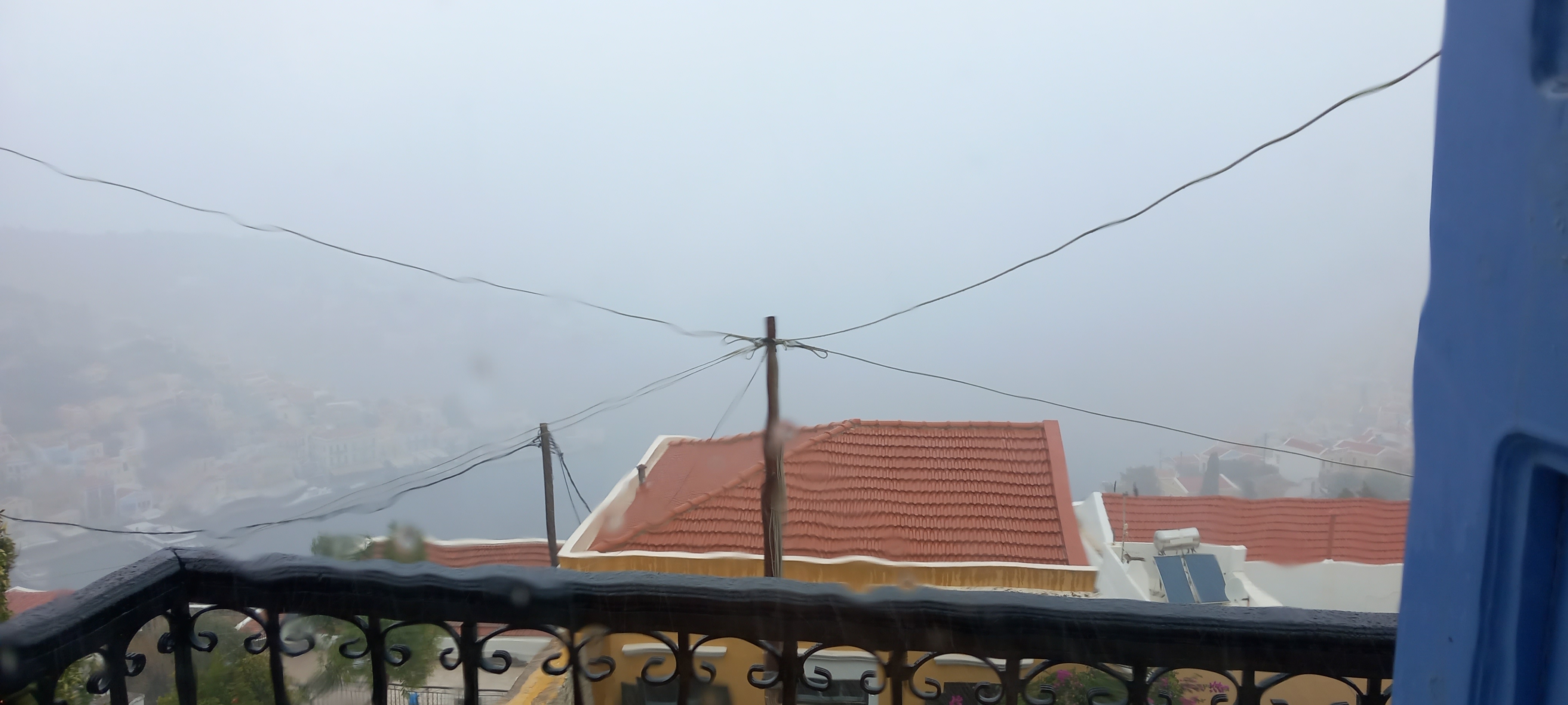 Towels down, the shutters needed to be closed, so windows open, a blast of rain and wind later, and the north side of the house was protected. Then the kitchen window started to rattle, so I nipped along there to close that (faces west), and all was dry. Ah, but the window looking onto the courtyard (east), already starting to drip, so open that, another blast, close the shutters, and all was sealed. Including where I had repaired the gaps between tiles and sloping roof over the porch, except that was still leaking a bit. And then there was no view from the front of the house at all.