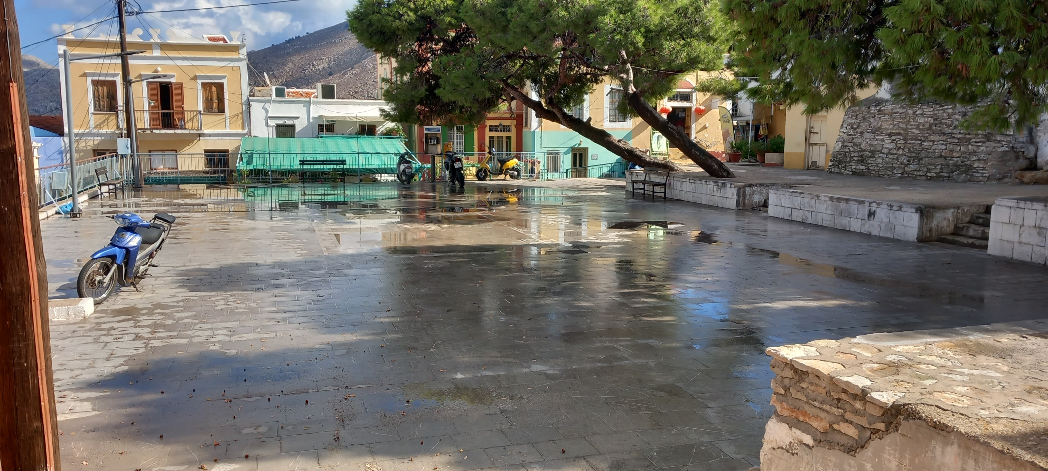 It doesn’t take much to get the newshounds stirring around here, and I suppose yesterday’s downpour constitutes news. I’d just done some washing, of course, and all the windows and shutters were open, as it’s still not cold enough to close them. Then I looked out of the window and saw this…